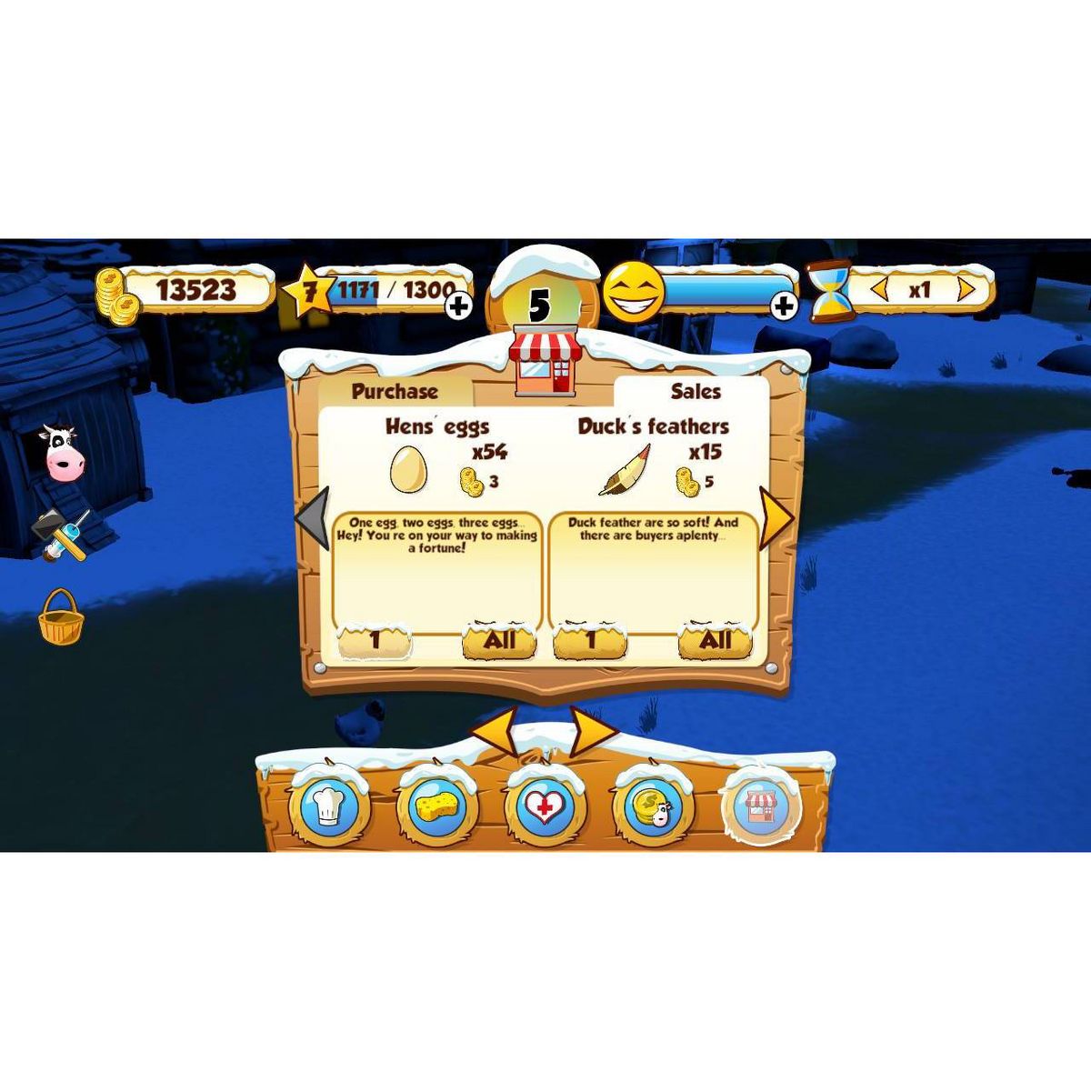 The aim of the game is to earn money by selling eggs and other farm produce, in order to buy more animals at the Farmers' Fair, and items that improve your farm from the Shopkeeper. Little by little, as your Farm develops, you will unlock bonuses items such as a wind turbine, a rooster, a dog, a tracter, etc. And you will be able to customize all our animals!