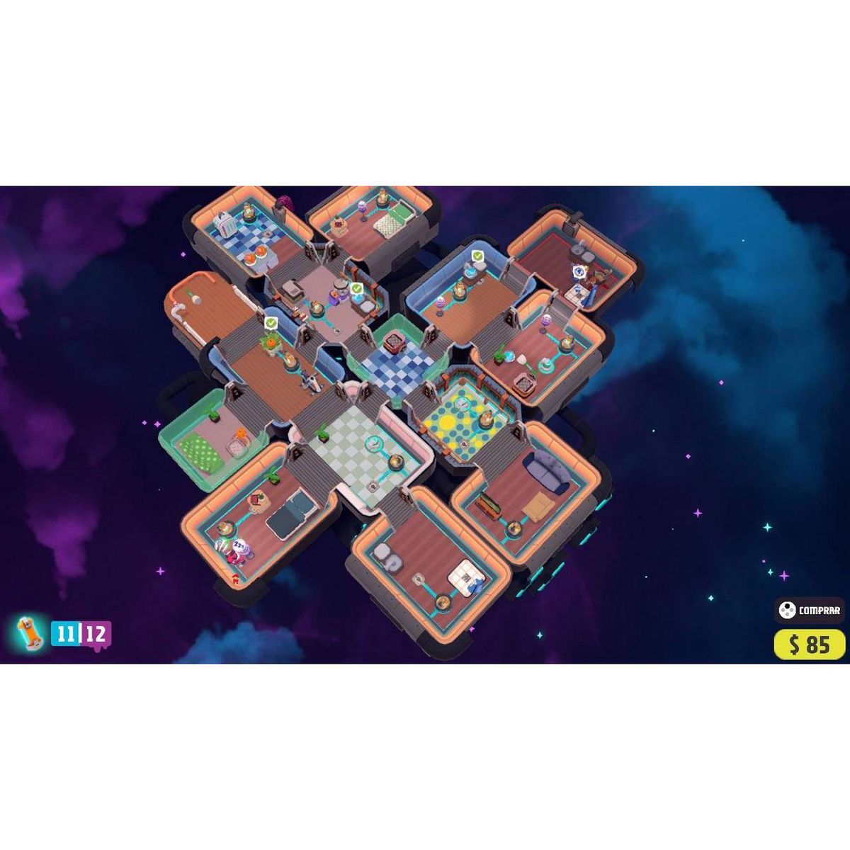 As a COUCH-FUN game, Out of Space has short matches and is easy for everyone to grab a controller and play. At the same time also as a STRATEGY game, it will require short and long-term decisions, expanding and conquering new rooms and building technology to automate tasks.