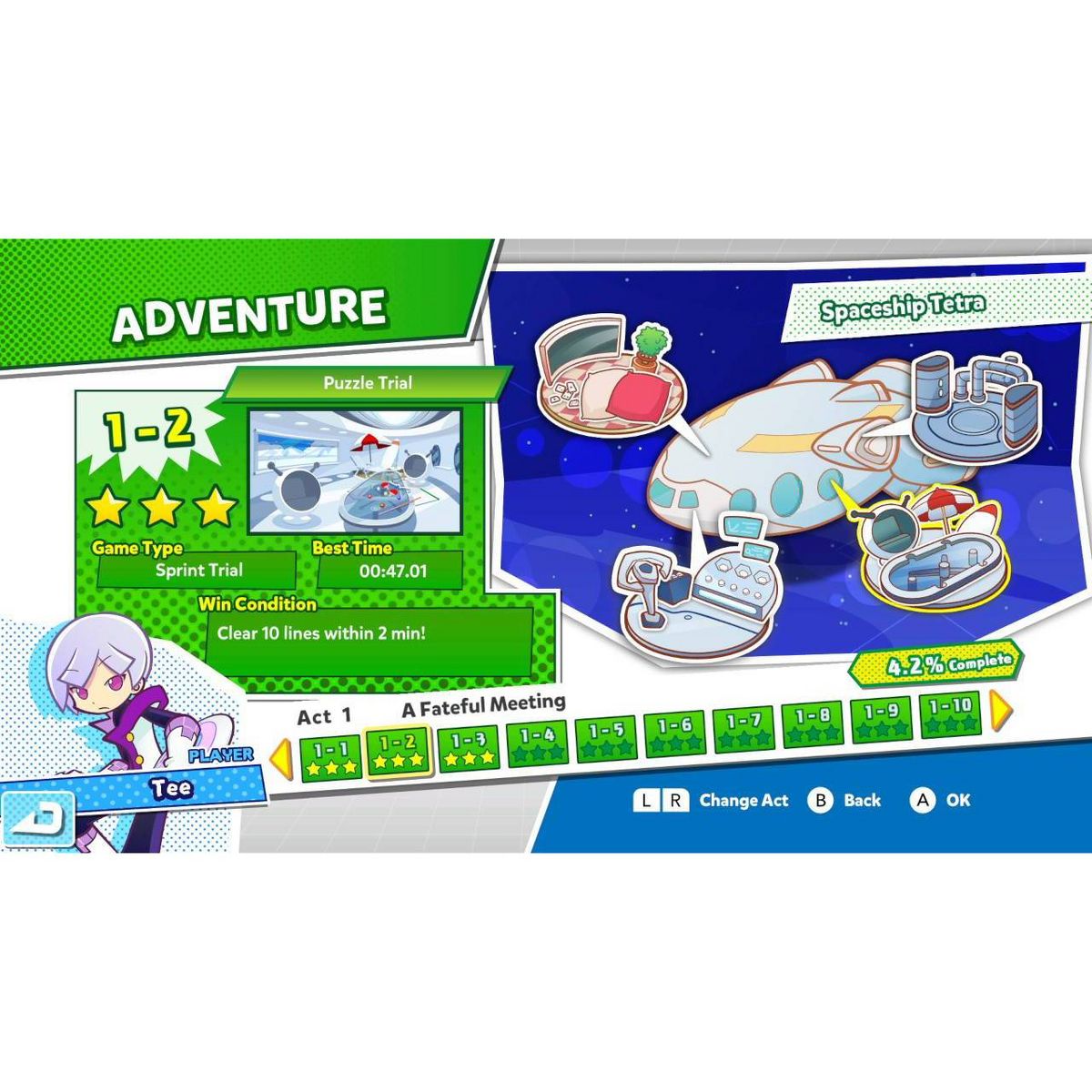 Two puzzle game juggernauts collide as Tetris , one of the largest-selling and recognized brands in gaming history, and Puyo Puyo from SEGA have combined to create a fun-to-play, fast-paced, competitive party game like no other! Features: Adventure – Single-player mode offers ten unique acts, each with ten stages featuring different characters from the Puyo Puyo and Tetris universes. Each stage contains unique challenges players will need to overcome in order to win and move on! Multiplayer Arcade – For up to four local players, Multiplayer Arcade offers a wealth of variety that will bring out players' competitive nature! Versus – Players compete head-to-head in either Puyo Puyo or Tetris to fight in the puzzle fight of their life. Swap – Players' abilities are put to the ultimate test when they compete on both Puyo Puyo and Tetris boards, which switch back and forth at set intervals. Fusion – A true hybrid game where players compete with Puyos and Tetriminos together on the same board, requiring deft, on-the-fly thinking to become victorious. Big Bang – It's a race to the finish as players compete against each other to clear unique challenge boards as quickly as possible to win. Party – Players compete on Puyo or Tetris boards, but the puzzles feature special items that when activated either help players or harm their opponents. Online – Players can try their puzzle skills on a global scale by playing any of the multiplayer modes with up to four players online, in Puzzle League or Free Play modes. Puzzle League – Increase player rating, earn ranks and aspire to new leagues in this mode for competitive enthusiasts. Free Play – A more casual experience where records aren't kept and players can customize matches with unique settings, and invite their friends to play. Replays – Players can save and upload any online matches to show off to their friends, or search other players' replays using the tag and filtering system to see how they tackle matches. Solo Arcade – Play any of the Multiplayer Arcade modes against the CPU in Battle or Endurance matches, or try the single-player Challenges! Battle – Substitute human players with 1-3 CPU opponents to fight against simultaneously. Endurance – Go the distance in a one-on-one gauntlet of never-ending CPU opponents, racking up as many wins as possible. Challenge – Forget about the opponents and put skills to the test with Sprint, Marathon and more, like the quirky Tiny Puyo, which shrinks down Puyos to fit even more on the board.