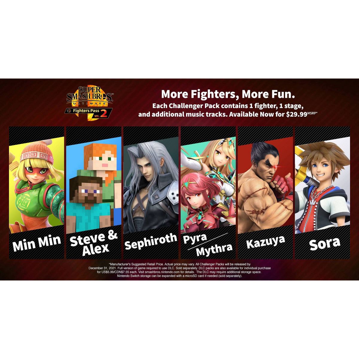 Expand your roster of fighters with the Super Smash Bros.TM Ultimate Fighters Pass Vol. 2 for the Super Smash Bros. Ultimate game! Purchase this Fighters Pass now to get access to six additional playable fighters, plus additional stages, and music as they release. Announced fighters include Min Min from ARMS TM, Steve & Alex from Minecraft TM , Sephiroth from FINAL FANTASY VII TM, Pyra/Mythra from Xenoblade Chronicles 2 TM , Kazuya Mishima from the TEKKEN TM series, and Sora from the KINGDOM HEARTS TM series!