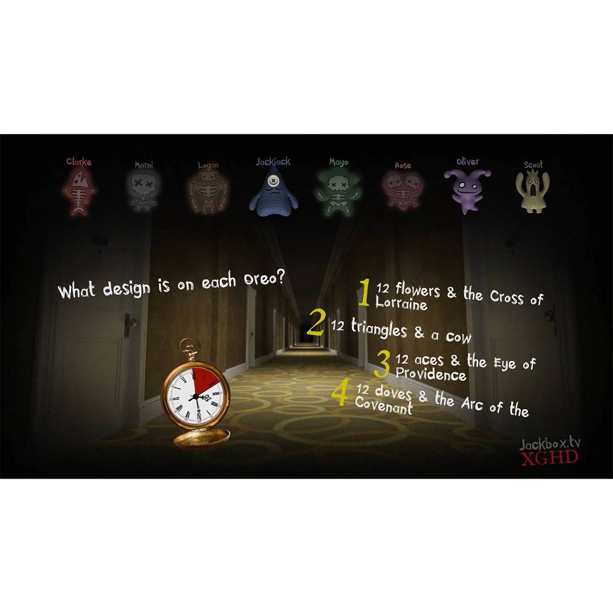 Created & Developed by Jackbox Games, Inc. Game and Software © 2019 Jackbox Games, Inc. All rights reserved. Jackbox Games, the Jack head logo, and the Jackbox Games logo are registered trademarks of Jackbox Games, Inc. Trivia Murder Party, Role Models, Joke Boat, Dictionarium, Push the Button, and Party Pack are trademarks of Jackbox Games, Inc. All other trademarks and logos are the property of their respective owners.