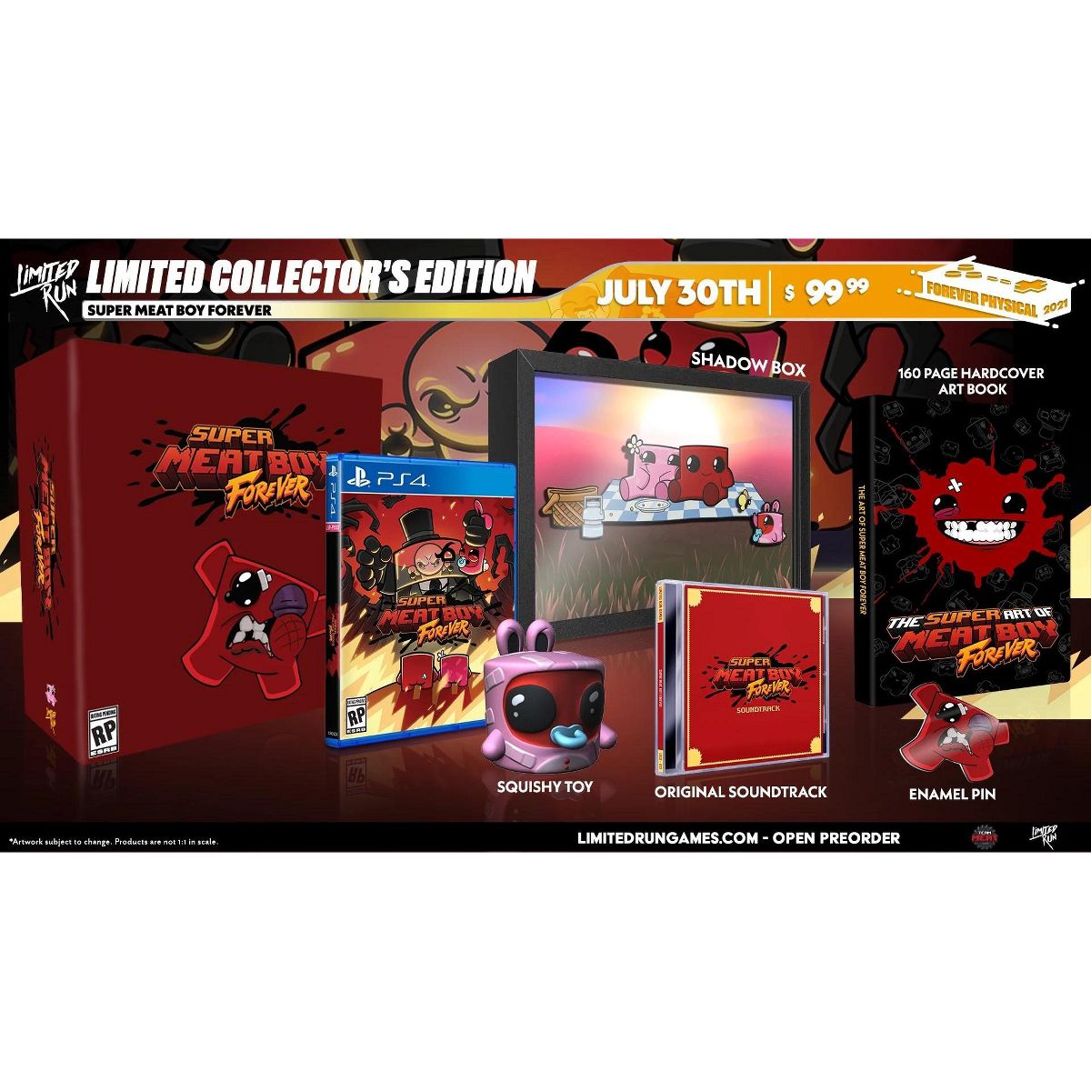 Super Meat Boy Forever from Limited Run Games for the PS4 takes place a few years after the events of Super Meat Boy.Collector's Edition includes:Physical Copy of Super Meat Boy Forever for PlayStation 4 Super Meat Boy Forever Collector's Box Shadowbox Super Meat Boy Forever Original Soundtrack 160 Page Hardcover Art Book Enamel Pin Squishy ToyMeat Boy and Bandage Girl have been living a happy life free of Dr. Fetus for several years and they now have a wonderful little baby named Nugget. Nugget is joy personified and she is everything to Meat Boy and Bandage Girl. One day while our heroes were on a picnic, Dr. Fetus snuck up on them, beat Meat Boy and Bandage Girl unconscious with a shovel and kidnapped Nugget! When our heroes came to and found that Nugget was missing, they knew who to go after. They cracked their knuckles and decided to never stop until they got Nugget back and taught Dr. Fetus a very important lesson. A lesson that can only be taught with punches and kicks.The challenge of Super Meat Boy returns in Super Meat Boy Forever. Levels are brutal, death is inevitable, and players will get that sweet feeling of accomplishment after beating a level. Players will run, jump, punch and kick their way through familiar settings and totally new worlds.What’s better than playing through Super Meat Boy Forever once? The answer is simple: Playing through Super Meat Boy Forever several times and having new levels to play each time. Levels are randomly generated and each time the game is completed the option to replay the game appears and generates a whole new experience by presenting different levels with their own unique secret locations. We’ve handcrafted literally thousands of levels for players to enjoy and conquer. You can replay Super Meat Boy Forever from start to finish several times before ever seeing a duplicate level. It is truly a remarkable feat of engineering and a monumental example of ignoring the limits of rational game design and production.They don’t give Oscars to games, but they probably will after Super Meat Boy Forever becomes the best movie of 2020 and 2021! Our story takes Meat Boy and Bandage Girl through several worlds in search of their darling little Nugget with beautifully animated cutscenes and musical accompaniment that makes Citizen Kane look like a reaction video to an sled unboxing.Players will laugh, they will cry, and when all is said and done maybe they’ll emerge from the experience a little better than when they started. Ok so that last part probably won’t happen but marketing text is hard to write ...Features:Physical Copy of Super Meat Boy Forever for PlayStation 4.Super Meat Boy Forever Collector's Box Shadowbox.Super Meat Boy Forever Original Soundtrack.160 Page Hardcover Art Book.Enamel Pin.Squishy Toy.