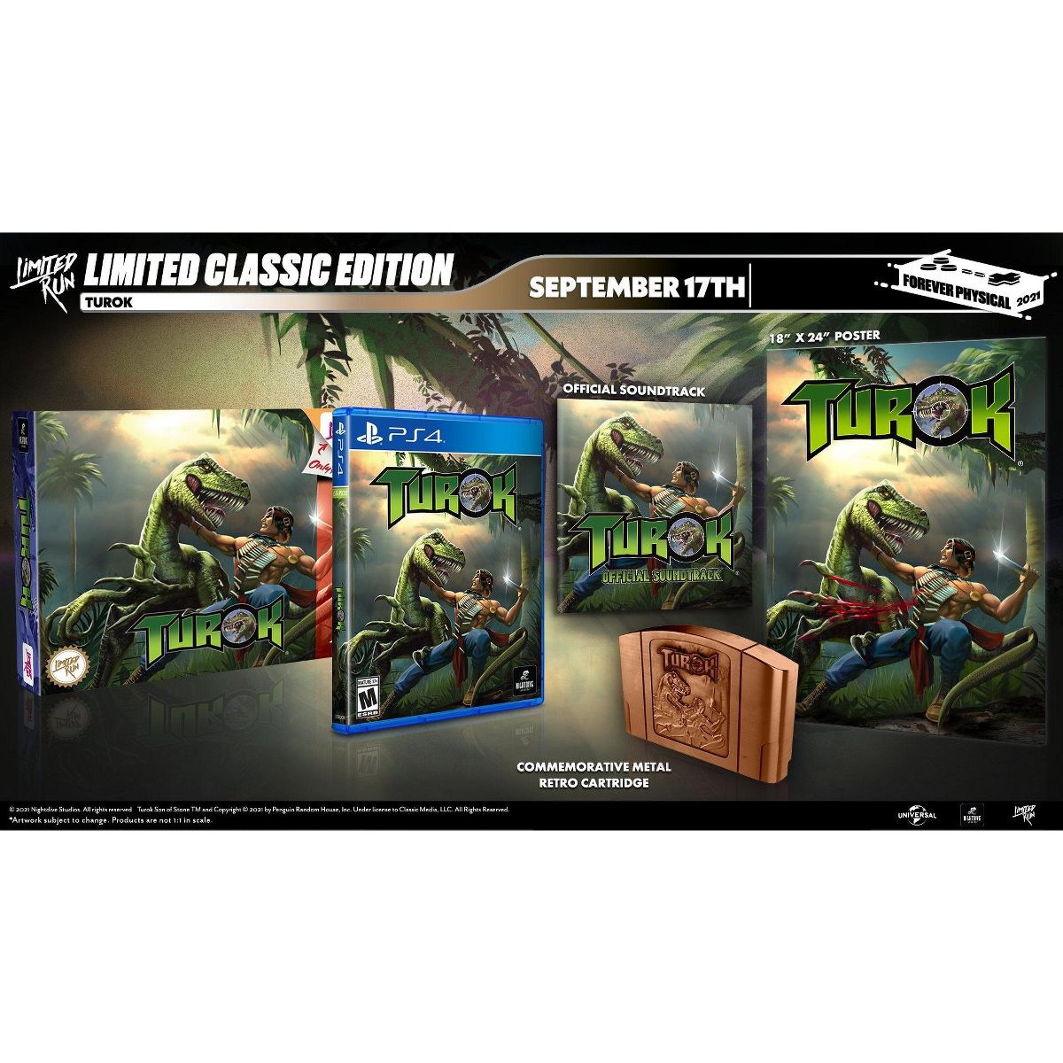 Turok - Classic Edition from Nightdive Studios and Limited Run Games for the Sony PS4 is back and no dinosaur is safe! When it was first released in 1997, Turok introduced gamers to a world teeming with cunning enemies, traps, puzzles and deadly weapons all within a vast 3D environment ready to explore.Classic Edition includes Limited Run #423: Turok for the PS4, Premium Embossed Foil Retro Throwback Collector's Box, the Official Soundtrack CD, a Commemorative Metal Retro Cartridge and an 18" x 24" Poster!Now the classic game has been restored and enhanced with a new visual engine and exciting new features to sink your teeth into!The Lost Land...A world where time has no meaning - and evil knows no bounds. Torn from a world long gone, the time traveling warrior Turok has found himself thrust into a savage land torn by conflict. An evil overlord known as 'The Campaigner' seeks to shred the fabric of time and rule the universe using an ancient artifact known as 'The Chronoscepter'. The Chronoscepter was shattered thousands of years ago in an effort to keep it from falling into evil hands.The Campaigner has constructed a massive focusing array which he plans to use to magnify and pervert the power of the Chronoscepter in order to shatter the barriers between the ages and rule the universe. Turok has vowed to find the eight pieces of the Chronoscepter spread throughout the Lost Land and put an end to The Campaigner's evil plot... To learn more you must enter the world of Turok!Features:Intelligent Enemies Programmed for Ferocity - Variable aggression profiles make each enemy behave uniquely.Completely 3-D Virtual World - Run, jump, climb in any direction in a fully 3D world, with the ability to independently look and aim your weapons up, down, or sideways.14 Monstrous High-tech Weapons - From the Grenade Launcher, Plasma Pulse Rifle and Alien Weapon, to the Quad Rocket Launcher and, the mother of all blasters, the Atomic Fusion Cannon!Bionically Engineered Dinosaurs - Razor-toothed Raptors. Artillery-packing Triceratops. Alien Infantry and a Laser-Guided T-Rex. Following your every move with head-tracking technology.Advanced Interactive Backgrounds with Particle Technology - Cobwebs sway. Bubbles form rings on the water's surface. Bullets ricochet. Trees explode into flames and crash to the ground. Waterfalls boil with foam.