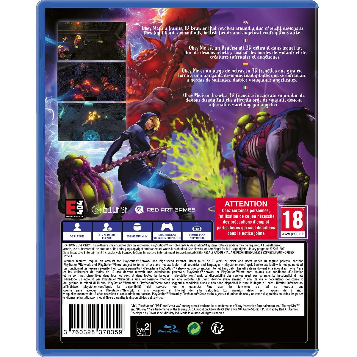 Obey Me from Blowfish Studios and Red Art Games for the Sony PS4 is a frantic 3D Brawler that revolves around a duo of misfit demons as they fight hordes of mutants, hellish fiends and angelical contraptions alike.In a time and age much like our own, Heaven and Hell are locked in an eternal conflict where the souls of Mankind are at stake. Vanessa Held, a lowly Soul Huntress, and her Hellhound companion, Monty, could be the ones to tip the balance of the war with their own hands. Embark on a journey in city fraught with peril, slashing, kicking and biting your way through hordes of foes, consuming their souls to unlock new combos, skills and transformations!Features:Fight alongside Monty, your canine partner, combining your attacks to crush whoever dares stand in your way.Scour the decaying city in search of secrets to learn more about the world of Obey Me and boost your chances of survival.Harvest the souls of fallen enemies, and use them to upgrade your weapons and Monty's transformations, making them even deadlier.Experience an immersive story with unique and intriguing characters, which can be played either on your own or with a friend in Local Coop.Obtain and master several different weapons, each having their own attacks and special abilities, and gain the upper hand against your foes.