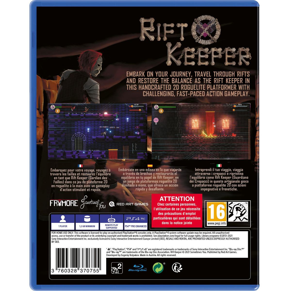Embark on your journey, travel through rifts and restore the balance as the Rift Keeper in this handcrafted 2D roguelite platformer from Sometimes You and Red Art Games for the Sony PS4, with challenging, fast-paced action gameplay.Duty called and the Rift Keeper woke up from his deep slumber. The little town he was summoned was silent as if it's the end.He opened the church's rusty old door and four old men wearing red robes greeted him with a grim smile.One of the priests stepped forward and said, 'The Gates are open...'Features:30 handcrafted dungeons!Unique enemies to fight with and many more to come!Loot epic gear as you progress through the dungeons. Find new weapons and accessories, grow your power!Embark on your journey, travel through 30 different dungeons! Grow powerful as enemies keep getting harder. How far can you go?
