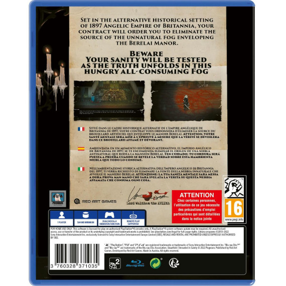 Skautfold: Shrouded in Sanity from Red Art Games for the Sony PS4 is a survival-horror game inspired by Resident Evil 1, Dark Souls, and Eternal Darkness.Set in the alternative historical setting of 1897 Angelic Empire of Britannia, your contract will order you to eliminate the source of the unnatural fog enveloping the Berelai Manor. Discover the secrets of the estate, as you look for answers among the violent inhabitants.A strange and repelling madness took hold of the servants roaming the halls, and they will attack on sight, for their madness is one rooted in a deeper understanding of cosmic insignificance.To repel the maddening horrors, your Iaito cane, and Waltham A9 hand canon will aid you. To mend your injuries your Vitae concoctions will offer healing.Beware, whatever unearthly events have transpired, your sanity will be tested as the truth unfolds in this hungry all-consuming Fog...Features:To mend your injuries your Vitae concoctions will offer healing.Beware - your sanity will be tested as the truth unfolds in this hungry all-consuming Fog.Discover the secrets of the estate, as you look for answers among the violent inhabitants.To repel the maddening horrors, your Iaito cane, and Waltham A9 hand canon will aid you.