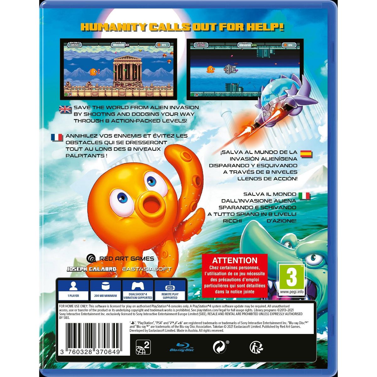 Humanity’s last hope has tentacles in Takotan from eastasiasoft and Red Art Games for the Sony PS4!The world has been taken over by an alien invasion. On the eve of destruction, humanity calls out for help! Takotan is a retro shoot’em up inspired by 16-bit classics.Save the world from alien invasion by shooting and dodging your way through 8 action-packed levels with sinister bosses! Collect a variety of power-ups including lasers, bowling balls and ninja stars to take down enemies and defend the planet!Features:Enjoy a more casual experience in Assist Mode, cutting all damage in half.Design your own challenge with Custom Mode to set max shield, lives, weapon, starting level and more.Test your skill in Panic Mode with only a shield power-up and no HP, allowing only 2 hits before you’re cooked!Play in Normal Mode with 1000 shield and 3 lives, letting you recover if you don’t take another hit too quickly.
