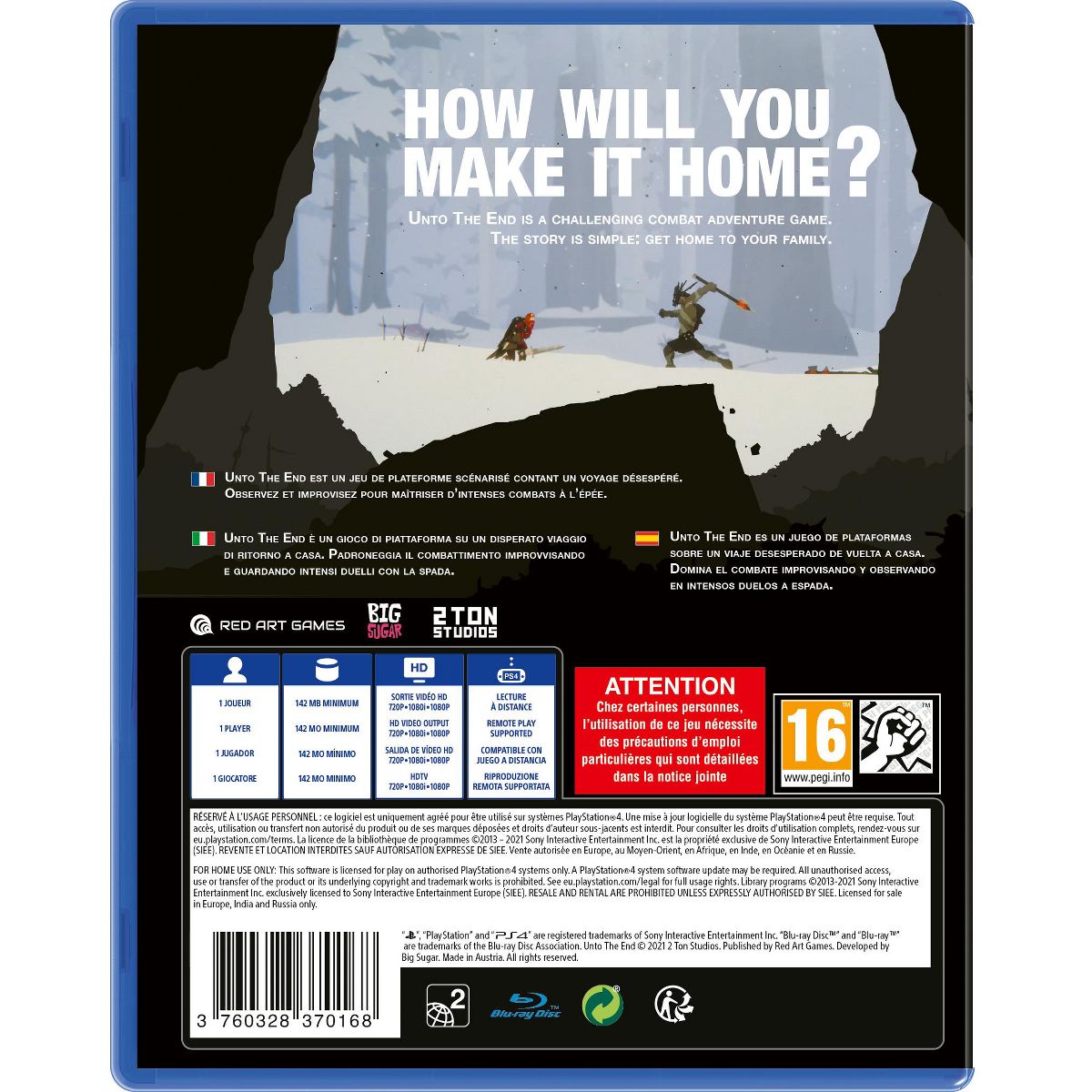 Unto The End from 2 Ton Studios and Red Art Games for the Sony PS4 is a challenging combat adventure game in the style of a cinematic platformer. The story is simple: get home to your family.Alone and outmatched, a humble father must endure a desperate journey to get back to his family. Armed with a sword, a dagger, and his wits, he must outfight and outsmart the creatures he encounters as he treks through unfamiliar lands, where every step brings him closer to home but is fraught with untold dangers. Master read-react combat in intense sword fights. Spot opportunities to trade and use items. An adventure told through your actions, how will you make it home?Features:Handcrafted Encounters - The adventure unfolds through carefully crafted encounters, each featuring intelligent, worthy opponents, all with their own motivations and place in the world.Unforgiving Terrain - From cavernous underground ruins to harsh mountain peaks, overcome environmental challenges and deadly traps as you travel through a world of meticulously crafted landscapes.Read-React Combat - One of a kind combat system focused on skill and mastery, designed and built from the ground up specifically for 2D. Fight intelligently and strike tactically with your sword and range weapons in fierce one-on-one and group battles.Player-Skill Focused - A challenging single-player experience with minimal handholding. All the father's abilities are available from the outset and mastery of those skills, as well as keen observation of your surroundings, are key to survival and success.