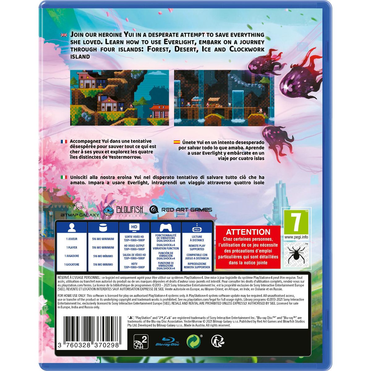 In YesterMorrow from Blowfish Studios and Red Art Games for the Sony PS4, follow Yui's journey into the past as she navigates parallel timelines to save her family and a world trapped in the Never-ending Night.YesterMorrow is a single-player time travelling 2D platformer, mixing action sequences with puzzle elements, all wrapped up in an engaging story about our young hero, Yui,who must save her family and to change the fate of a world that has been plunged into endless night.This can only be done by journeying into the past and repairing the mysterious Clocktower controlling the cycle of time.Her world - destroyed. Her family - kidnapped. Join our heroine Yui in a desperate attempt to save everything she loved.Learn how to use Everlight, embark on a journey through four islands (Forest, Desert, Ice and Clockwork island) and use time travel to overcome obstacles and access hidden locations.Free your family from the clutches of Shadows! Find out what really happened to the Sun and whether it can be reversed!Features:Locate hidden areas and collect power-ups and lore entries.Encounter dozens of creatures and defeat challenging bosses.Use the environment to your advantage and solve puzzles in different ways.Explore a vast world of YesterMorrow spanning four different islands (Forest, Desert, Ice, Clockwork).Discover the rich lore as you interact with the world and its inhabitants. And don’t forget to pet all animals!Learn how to wield Everlight, unlock six special abilities and use them to cleanse your world from Shadows.Traverse the world in two different timelines. Enjoy the serene calmness of the past and battle your way through the corrupted world of the future.