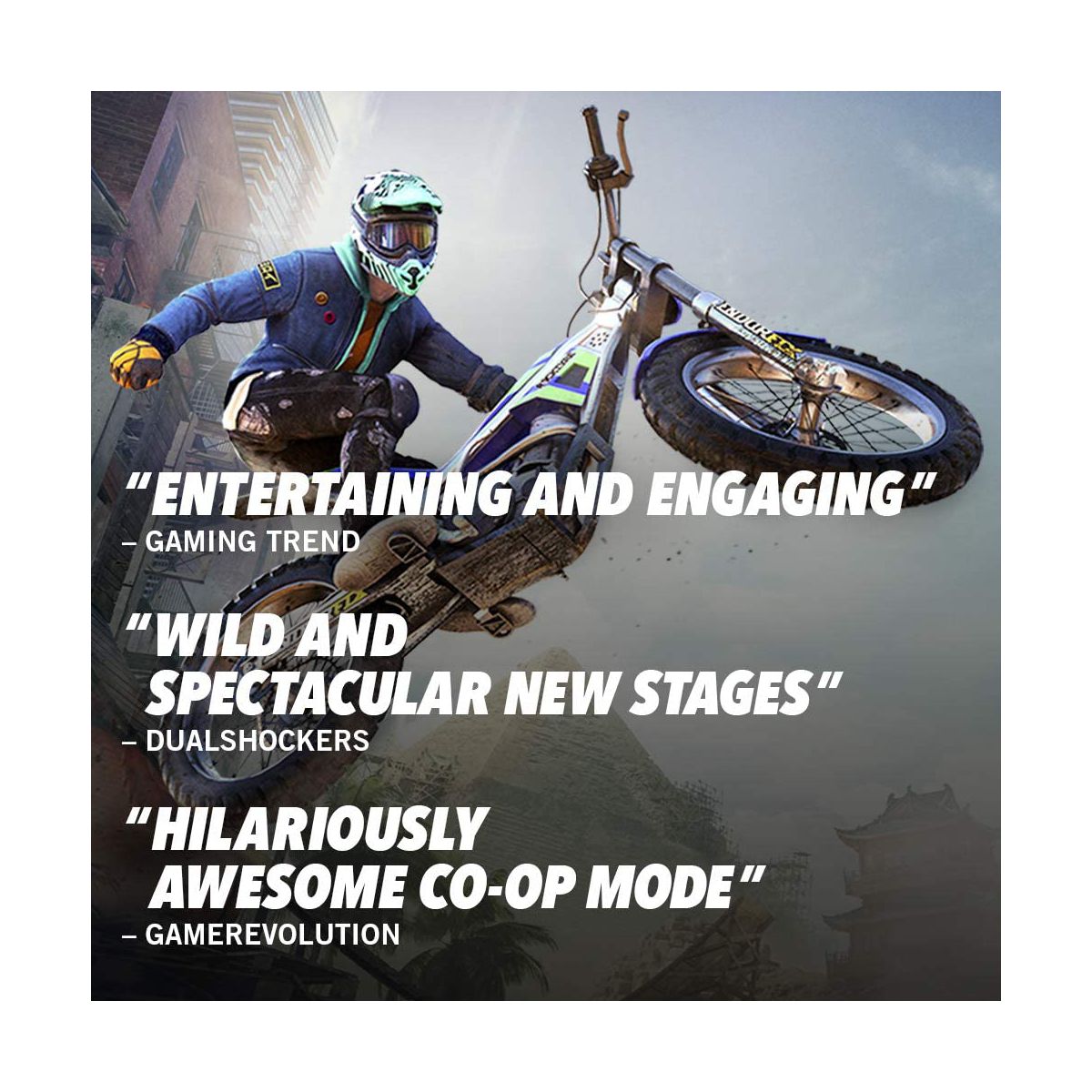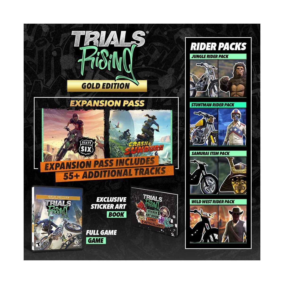 Explore over-the-top action and physics-bending motorcycle racing in Trials Rising - Gold Edition from Ubisoft for the Sony PS4, the latest edition of the Trials franchise.The Gold Edition includes the full game, the Expansion Pass and an exclusive sticker book!Explore over-the-top action and physics-bending motorcycle racing in the latest opus of the Trials franchise.With new tracks in exotic places all over the world and more ways to compete, Trials Rising is the best one yet.All new features, more competitions, and more tracks mean new challenges!Features:The Gold Edition includes the full game, the Expansion Pass and an exclusive sticker book.From your local backyard to worldwide stadiums, defeat all your opponents online and rise to glory.With the new hilarious Tandem Bike mode, partner with a friend and try to control one bike with two riders.Create unique levels in Track Central using hundreds of different components. The possibilities are endless – and so is the fun!Ride challenging tracks around the world – from the Great Wall of China and New York City to the Eiffel Tower and everywhere in between.
