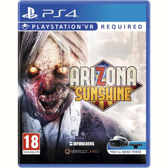 Arizona Sunshine from Vertigo Games for the Sony PS4 is an FPS built exclusively for VR that immerses you in a post-apocalyptic southwestern America overrun by zombies.Virtual reality meets the zombie apocalypse! When you hear a flash of a human voice on the radio, your hopes surge - there are survivors out in the blistering heat of the post-apocalyptic Grand Canyon state!Armed with little more than your motion-controlled weapons and the scarce ammo and consumables you find along the way, navigate the hordes of zombies coming for your brain in your search for human contact. Virtual reality meets the zombie apocalypse, Arizona Sunshine is an FPS built exclusively for VR that immerses you in a post-apocalyptic southwestern America overrun by zombies!Features:Real-life weapon handling: Using “PS Move” controllers or the “PS VR” Aim Controller, handle a range of weapons with real-life movements.Full-size campaign: Built in VR-sized chunks that together form a full narrative.Free exploration: Move around freely to explore treacherous canyons, deep, dark mines, and more.Co-op multiplayer: Join forces in co-op campaign or multiplayer Horde mode.