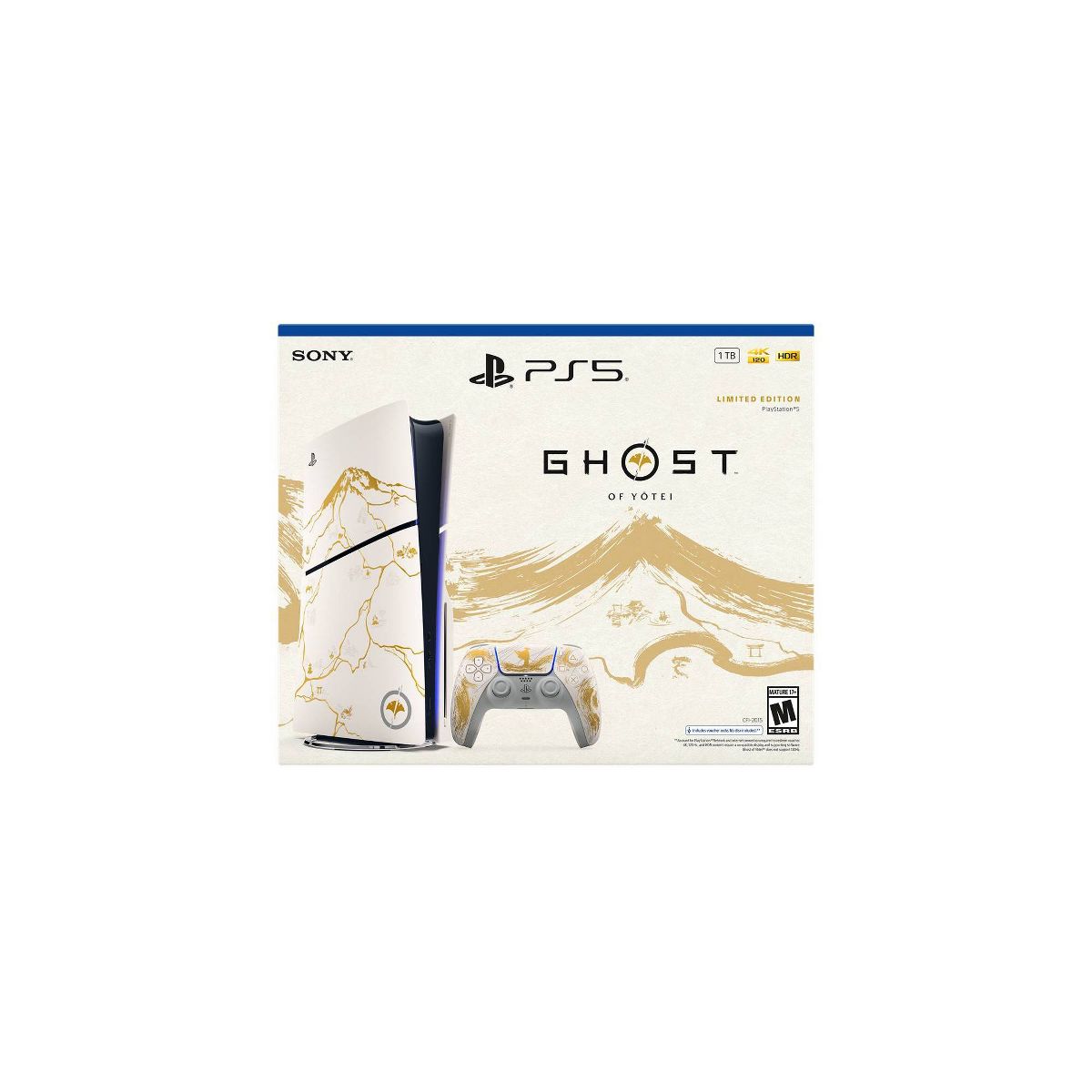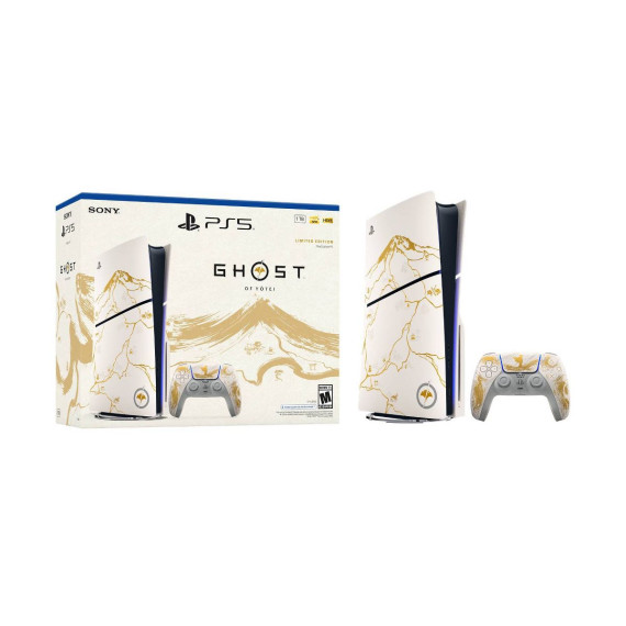PlayStation®5 Console – Ghost of Yōtei™ Gold Limited Edition Bundle includes: Limited Edition PlayStation®5 console, Limited Edition DualSense® wireless controller, Ghost of Yōtei™ full game voucher (includes pre-order digital content), 1TB SSD, Disc Drive (attached to the console), 2 Horizontal Stand Feet, HDMI® cable, AC power cord, USB cable, printed materials, and ASTRO’S PLAYROOM (Pre-installed game).