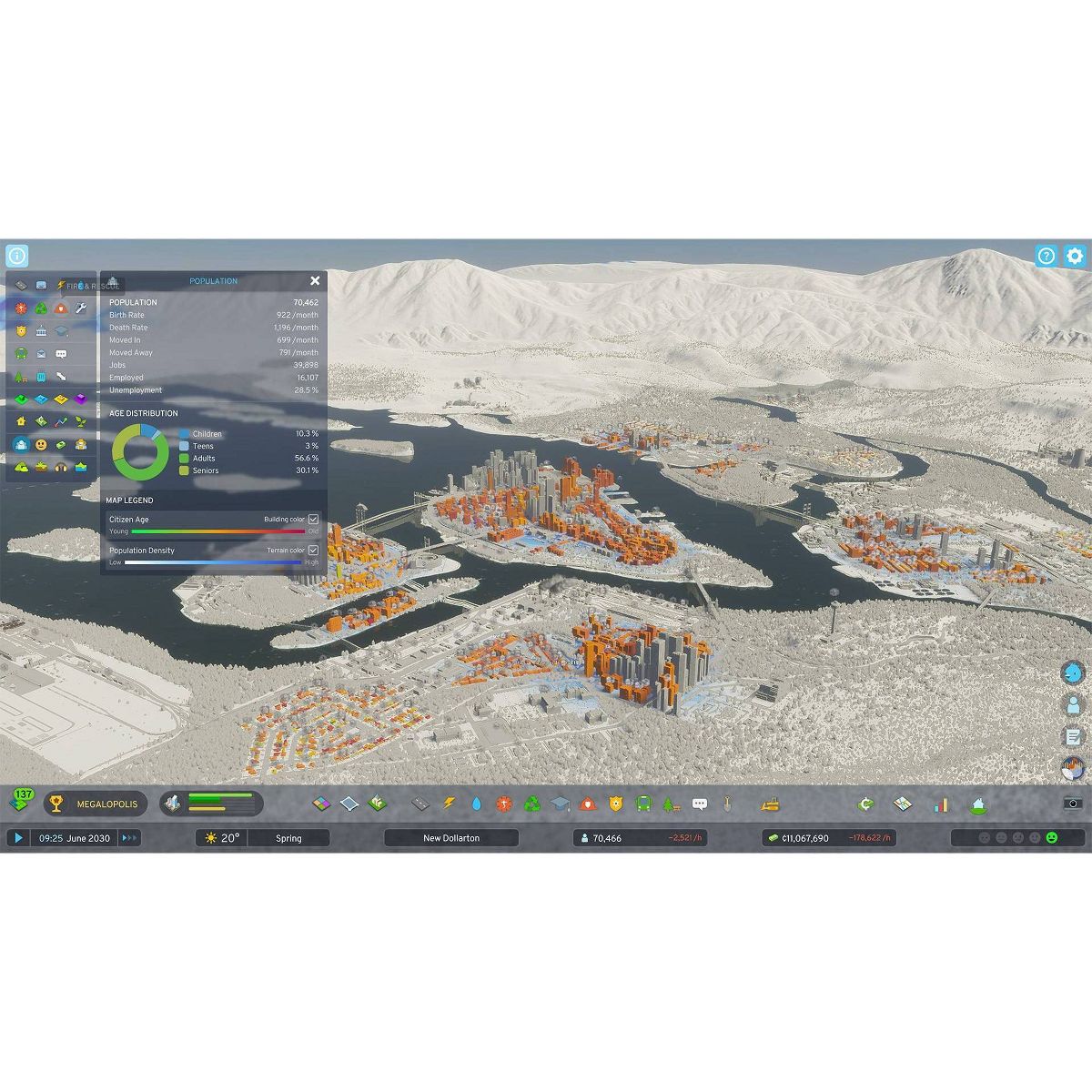 Players start by picking a map, with each environment presenting its own challenges, climate, and opportunities. From there, players manage a series of interconnected simulation systems as they build and grow their city. Build roads, lay out districts, set up infrastructure, and manage citizens’ needs as the population grows from a small town to a sweeping metropolis.