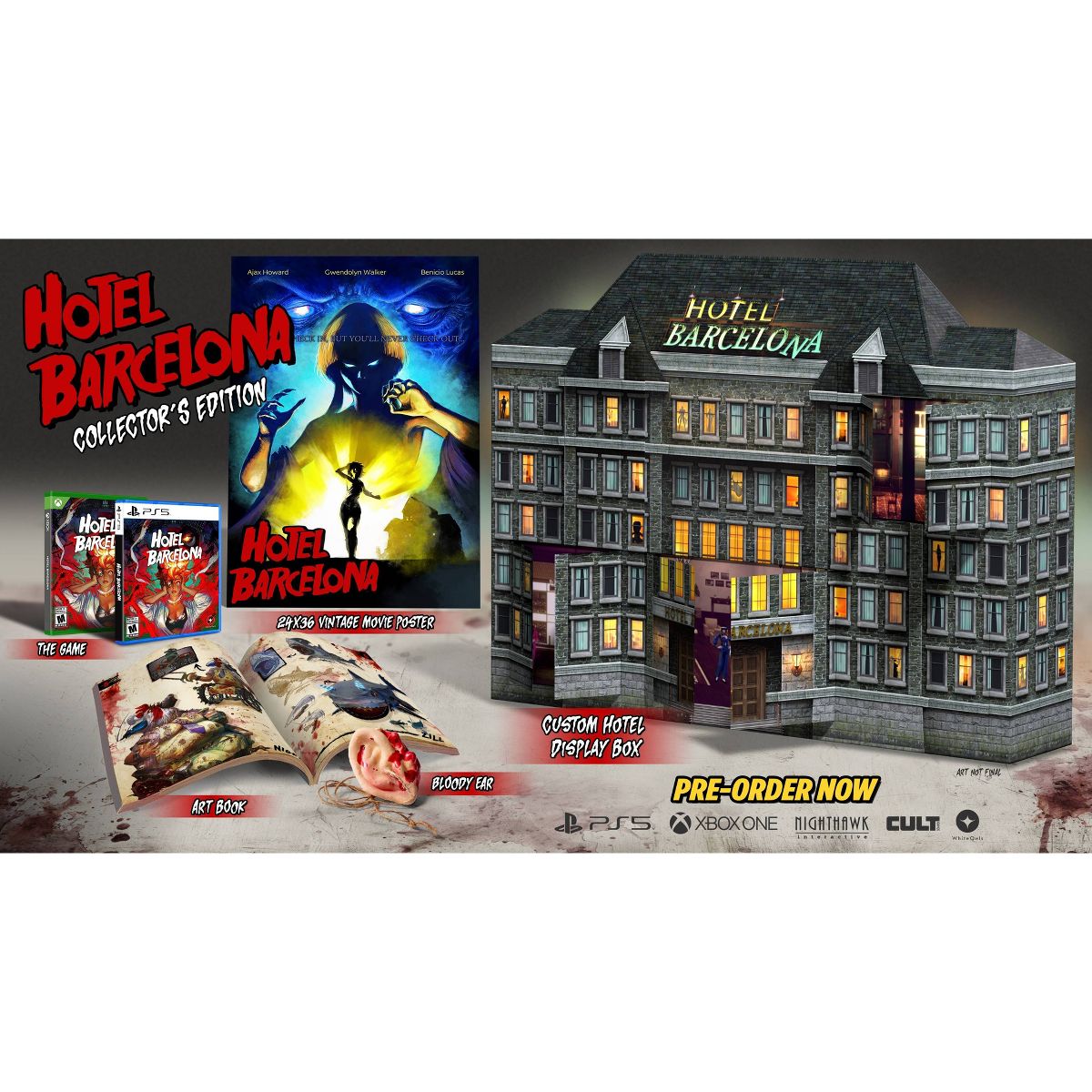 Collector's Edition includes custom Hotel Barcelona display box, 24x36 vintage movie poster, bloody ear, art book, and a physical copy of Hotel Barcelona.