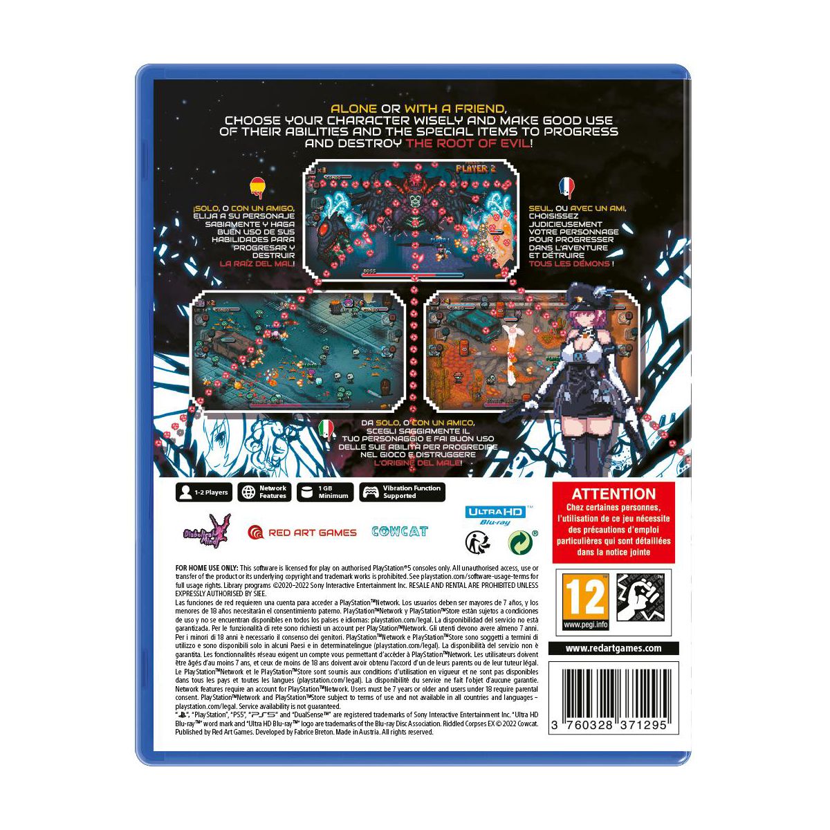 Riddled Corpses EX from COWCAT and Red Art Games for the Sony PS5 is a twin-stick shooter made in the style of 8/16 bit arcade games.Travel through diverse locations packed with danger and huge bosses!Choose your character wisely and make good use of their abilities and the special items (clock, dynamite and turrets) to progress and destroy the root of evil!Register your best scores on the online leaderboard!Features:Combo system.2 player local coop.Quality chiptune music.60 FPS fast-paced action.Arcade, story and survival modes.6 characters with varying stats and abilities.
