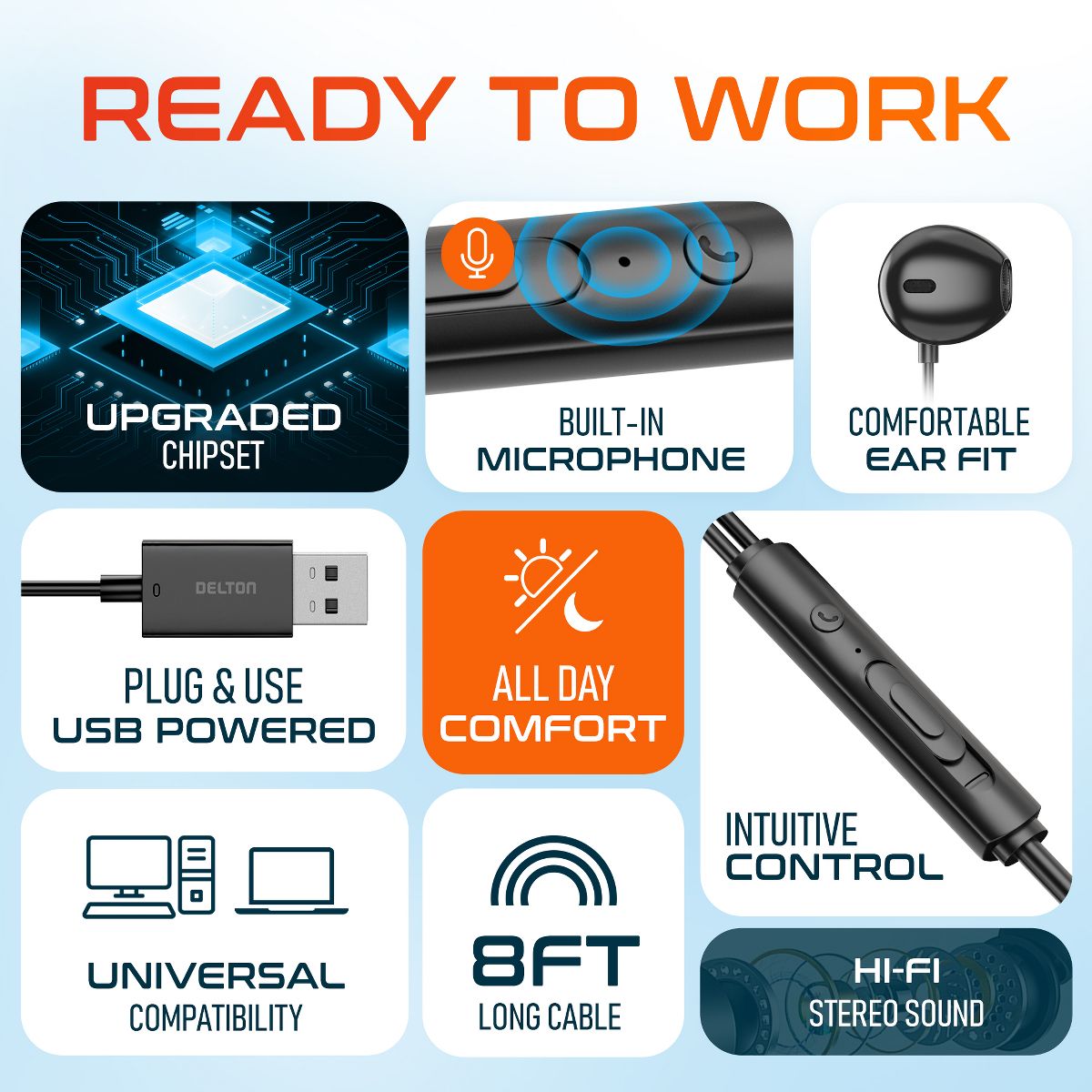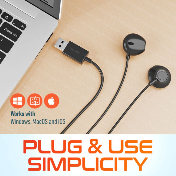 Delton DWH10E wired earbuds with microphone feature an ergonomic design that ensures a comfortable fit, even during extended wear. Enjoy crystal clear calls and immersive audio with universal compatibility through USB. Just plug in and you are ready to go. The 8 foot cable offers flexibility for movement and multitasking, while dynamic drivers deliver rich sound quality. Integrated controls let you manage volume and calls effortlessly, keeping you focused on the task at hand.