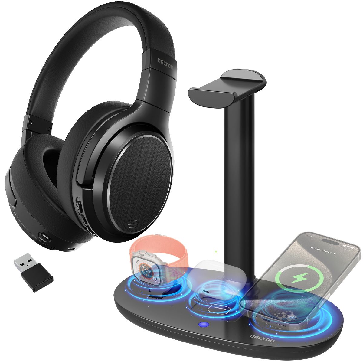 Delton M101 Wireless Noise Canceling Bluetooth Stereo Computer Headset and HS1 Stand/Desktop Organizing Wireless Charger, Black