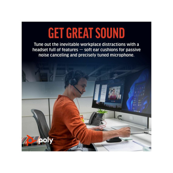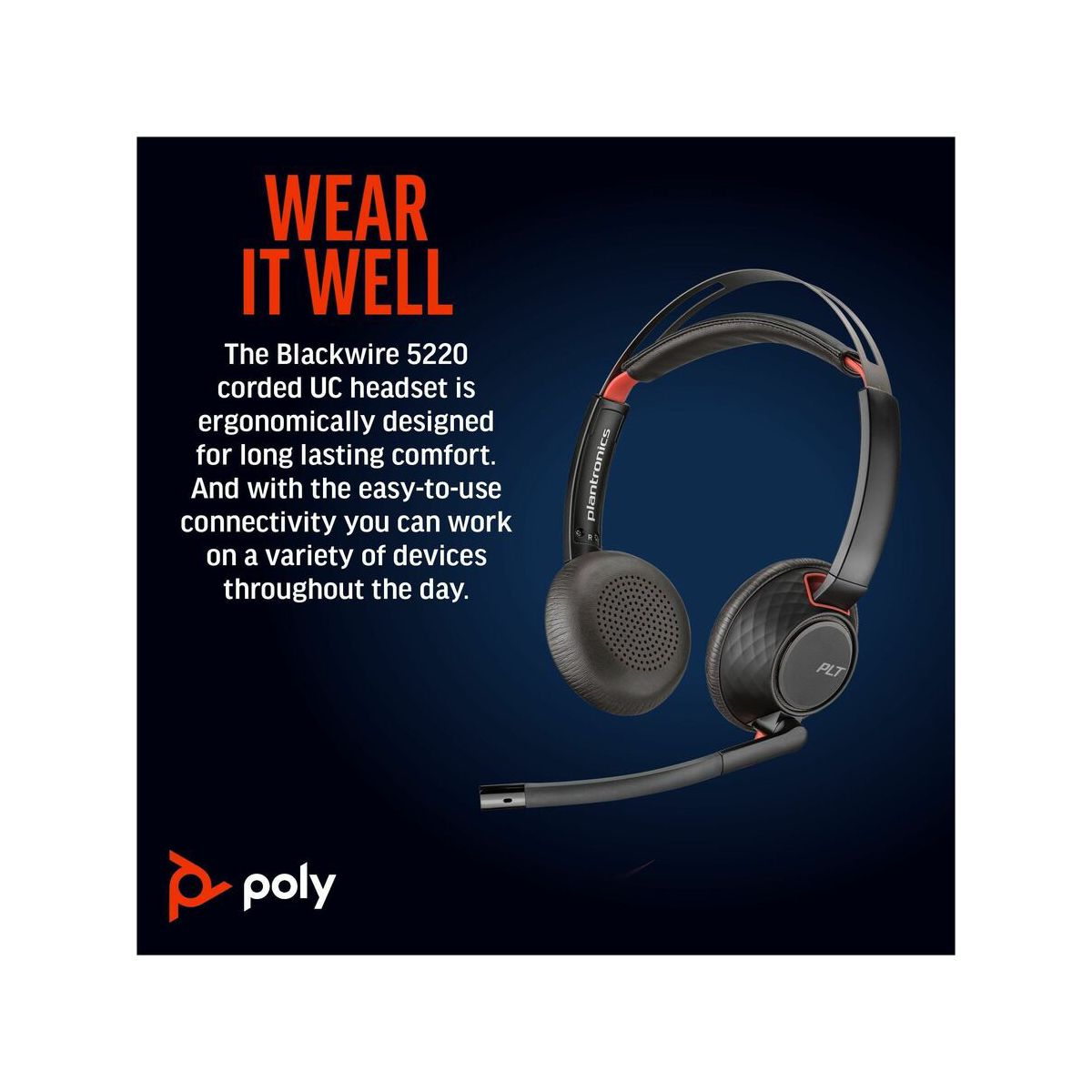 Wear it wellThe Blackwire 5200 Series fits your busy workday. Ergonomically designed for long lasting comfort. And with the easy-to-use connectivity you can work on a variety of devices throughout the day.Get great soundTune out the inevitable workplace distractions with a headset full of features - soft, conforming ear cushions that provide passive noise canceling and a precisely tuned microphone masks nearby conversations.Enjoy long lasting comfortYour ears will thank you, especially after long conference calls. This headset is built to stay comfortable. Adjust it to fit the way you work. Need to move locations? The headset folds up for easy portability in the carrying case.Features | Connectivity options Enhanced connectivity for your devices: USB-C cord with tethered USB-A adapter for PC and 3.5 mm for mobile or tablet connectivity.Comfort and durability Ultra-soft leatherette ear cushion(s) wrapped around pillow-soft memory foam provide long lasting comfort. A lightweight cushioned metal headband offers durability and a comfortable custom fit.Wearing style Hi-fi stereo wearing style for those who want a richer, more immersive experience.Simple call management Use the intuitive inline controls to answer/end calls, control volume, and mute to simplify call management. Conveniently placed indicator lights provide helpful but unobtrusive user call, mute, and volume status.Outstanding audio quality Premium PC wideband audio with noise-canceling microphone and Digital Signal Processing (DSP) for a more natural voice sound.Enhanced call quality Dynamic EQ optimizes the quality of your voice on calls, and automatically adjusts the EQ settings when you want high-quality sound for listening to music or for multimedia playback.