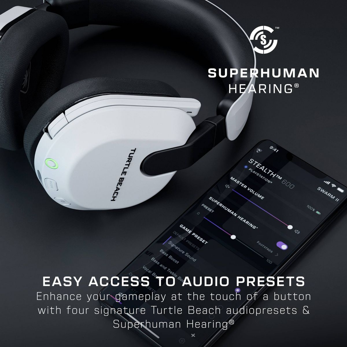 Completely redesigned for the third generation of the Stealth 600, the all-new uni-directional, flip-to-mute microphone features A.I. noise reduction to ensure ultra-clear mic quality with the quietest background possible. Using the Swarm™ II desktop software for PC, or mobile app for iOS & Android devices, you can adjust noise gate, sensitivity, monitoring levels, and choose from four different mic presets, or even make your own with a custom 10-band microphone EQ. Clear comms are nothing if you can’t hear every vital game detail, so the Stealth™ 600 is packed with the legendary 50mm Nanoclear™ drivers for precise, immersive spatial audio quality. And with the Swarm™ II app, you can cycle through four audio EQ presets, create up to five custom presets with a 10-band EQ, adjust game & chat volume mix, plus activate, or adjust Turtle Beach® exclusive Superhuman Hearing® sound setting.
