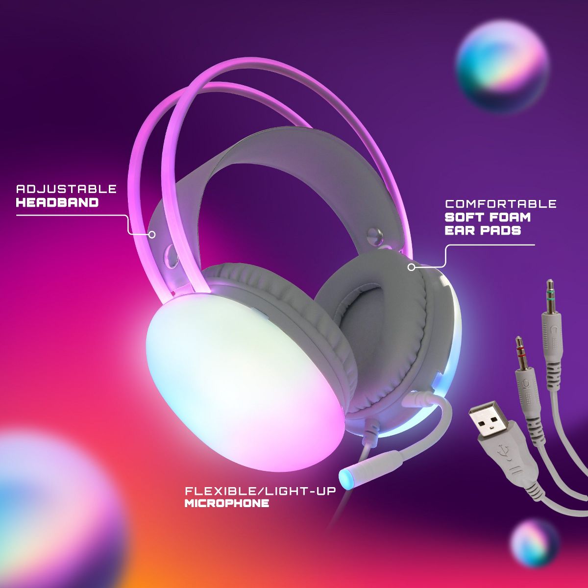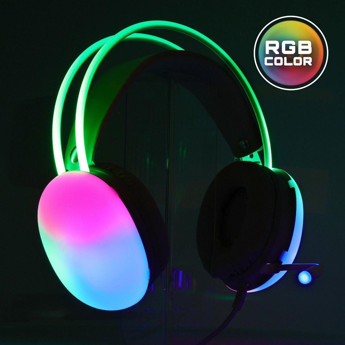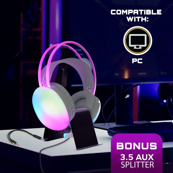 Level up your gameplay with the Wired Rainbow Multicolor Gaming Headset, a wired gaming headset packed with features that take your audio experience to the next level. Lose yourself in stunning sound powered by 50mm drivers and virtual 7.1 surround sound, pinpointing every footstep and explosion with pinpoint accuracy. Communicate clearly with your squad thanks to the flexible, noise-cancelling microphone that captures your voice loud and crisp. Game for hours in comfort with the lightweight design and breathable ear cups, while the auto-adjusting headband ensures a perfect fit every time. Unleash your inner gamer with the dazzling RGB lighting that pulses and shifts color across the ear cups, creating a captivating atmosphere for every epic battle. Plus, the 3.5mm jack ensures universal compatibility with PC, PS4/PS5, Xbox, Mac, and laptops, letting you dominate across all your platforms. Here's what makes the Wired Rainbow Multicolor Gaming Headset your ultimate gaming weapon: Immersive Audio: 50mm drivers and virtual 7.1 surround sound deliver precise, room-filling audio that puts you right in the heart of the action. Crystal Clear Communication: Noise-cancelling microphone captures your voice with clarity, ensuring seamless communication with your teammates. Lightweight Comfort: Breathable ear cups and an auto-adjusting headband provide long-lasting comfort for marathon gaming sessions. Vibrant RGB Lighting: Customizable RGB lights across the ear cups add a touch of flair and enhance your gaming atmosphere. Universal Compatibility: 3.5mm jack works with PC, PS4/PS5, Xbox, Mac, and laptops for total gaming flexibility. Don't just play the game, own it. Elevate your audio experience and unleash your full potential with the Wired Rainbow Multicolor Gaming Headset.