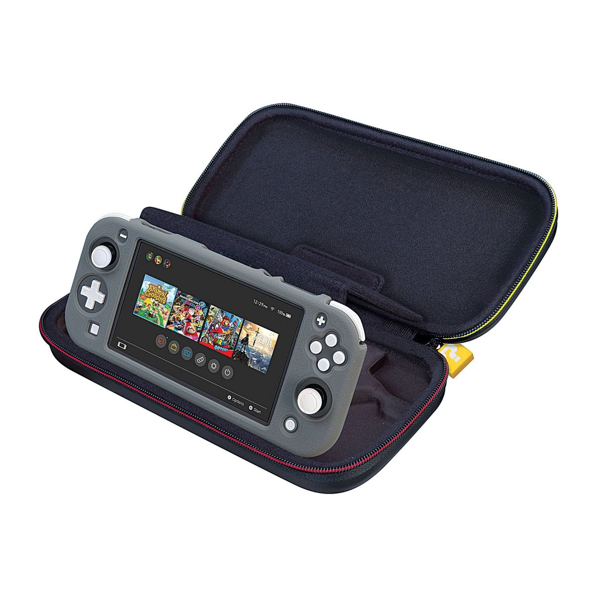 Nintendo Switch Game Traveler Deluxe Travel Case features Super Mario characters. The hardshell case protects Nintendo Switch, Nintendo Switch Lite or Nintendo Switch OLED. The case has a built-in viewing stand to easily adjust to your desired viewing angle. Includes game card case to hold up to 4 games. Includes Micro SD card case to hold up to 2 cards. NNS53A