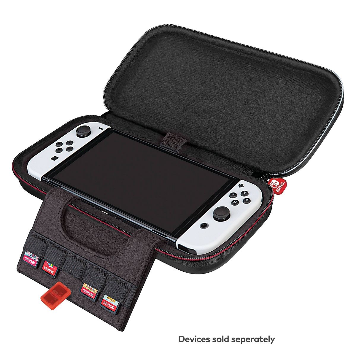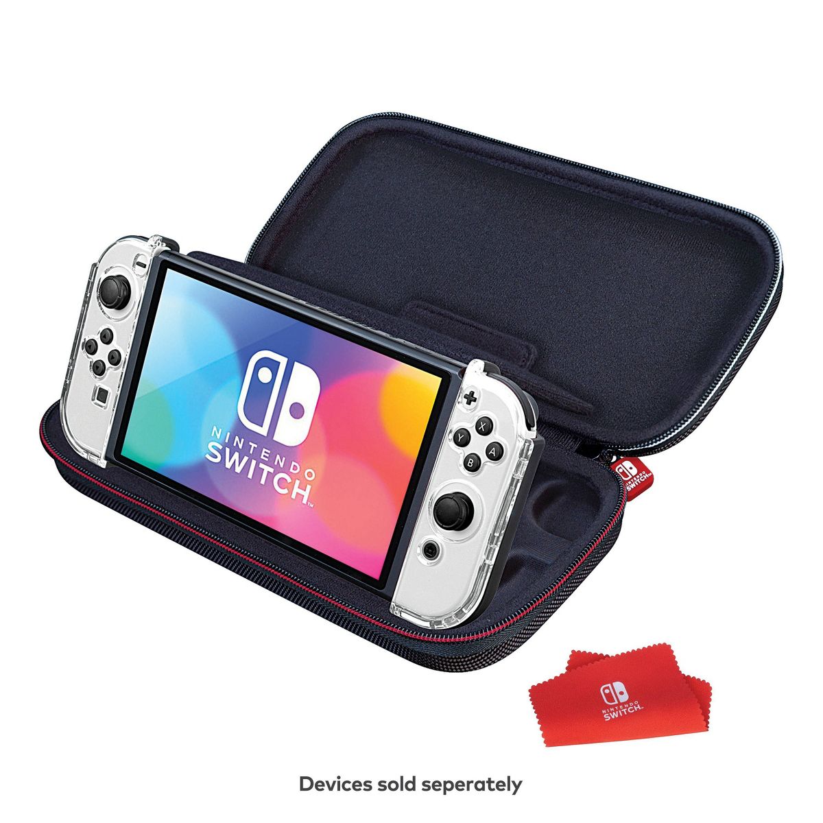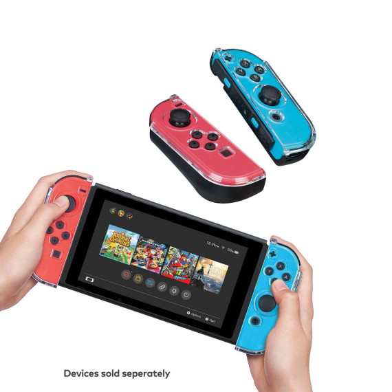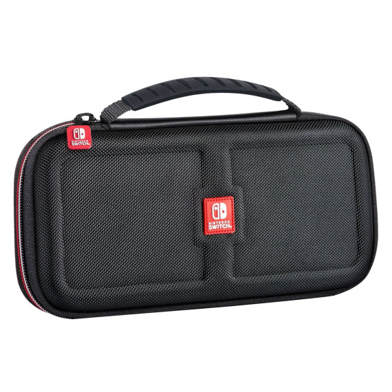 The Ultimate PLAY and STORE solution for your Nintendo Switch. This GOPLAY bundle protects your Nintendo Switch or Nintendo Switch OLED Hardware in this 100% Nintendo licensed Switch case manufactured to Nintendo's stringent standards by RDS Industries. The GOPLAY Traveler case durable hard-shell exterior protects against accidental drops or knocks, and the vacuum foamed felt lined interior holds the system and games securely in place. Most importantly, a padded divider is in place designed specifically to protect Switch's sensitive analog sticks. The GOPLAY GRIP improves game play via the comfort ergonomic rubberized grips that lessen game fatigue. The GOPLAY Grip also serves as a stable and secure viewing stand. NNS82