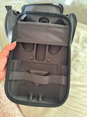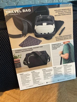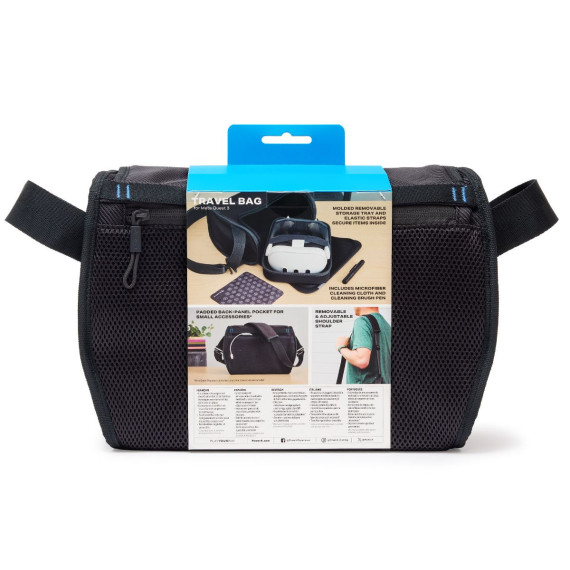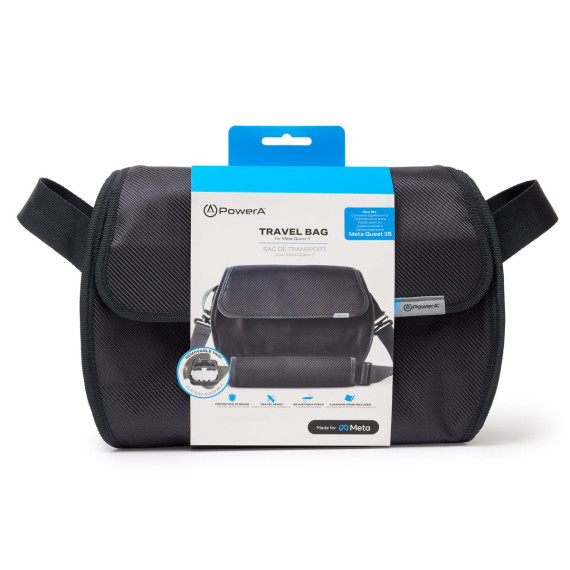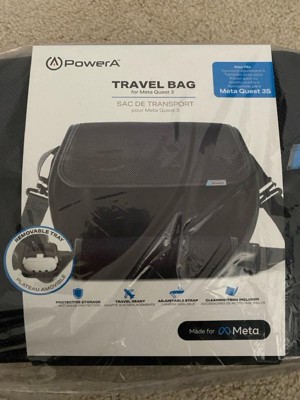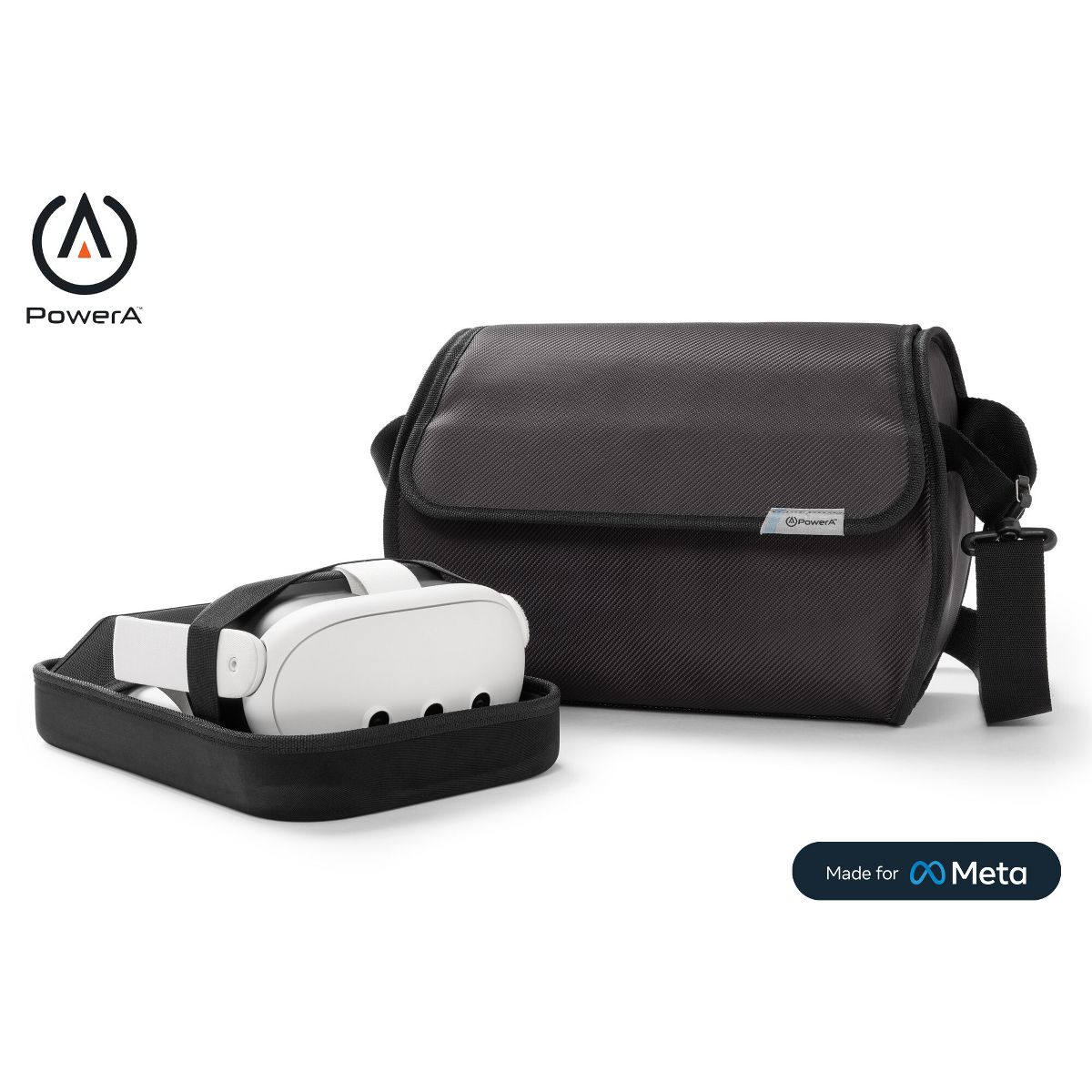 Take your Meta Quest 3 / 3S with you safely and stylishly with the PowerA Travel Bag for Meta Quest 3 / 3S. This officially licensed travel bag features a molded storage tray and elastic straps to securely hold your headset and controllers in place. The zippered closure helps protect your gear from dust and dirt, and the removable adjustable shoulder strap allows it to be worn crossbody or on the shoulder. A padded back-panel pocket holds earbuds or other small accessories. Includes a microfiber cleaning cloth and brush pen to keep your headset clean. 2-Year Limited Warranty.