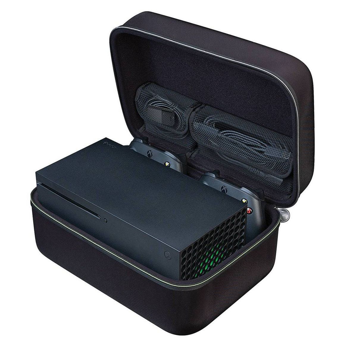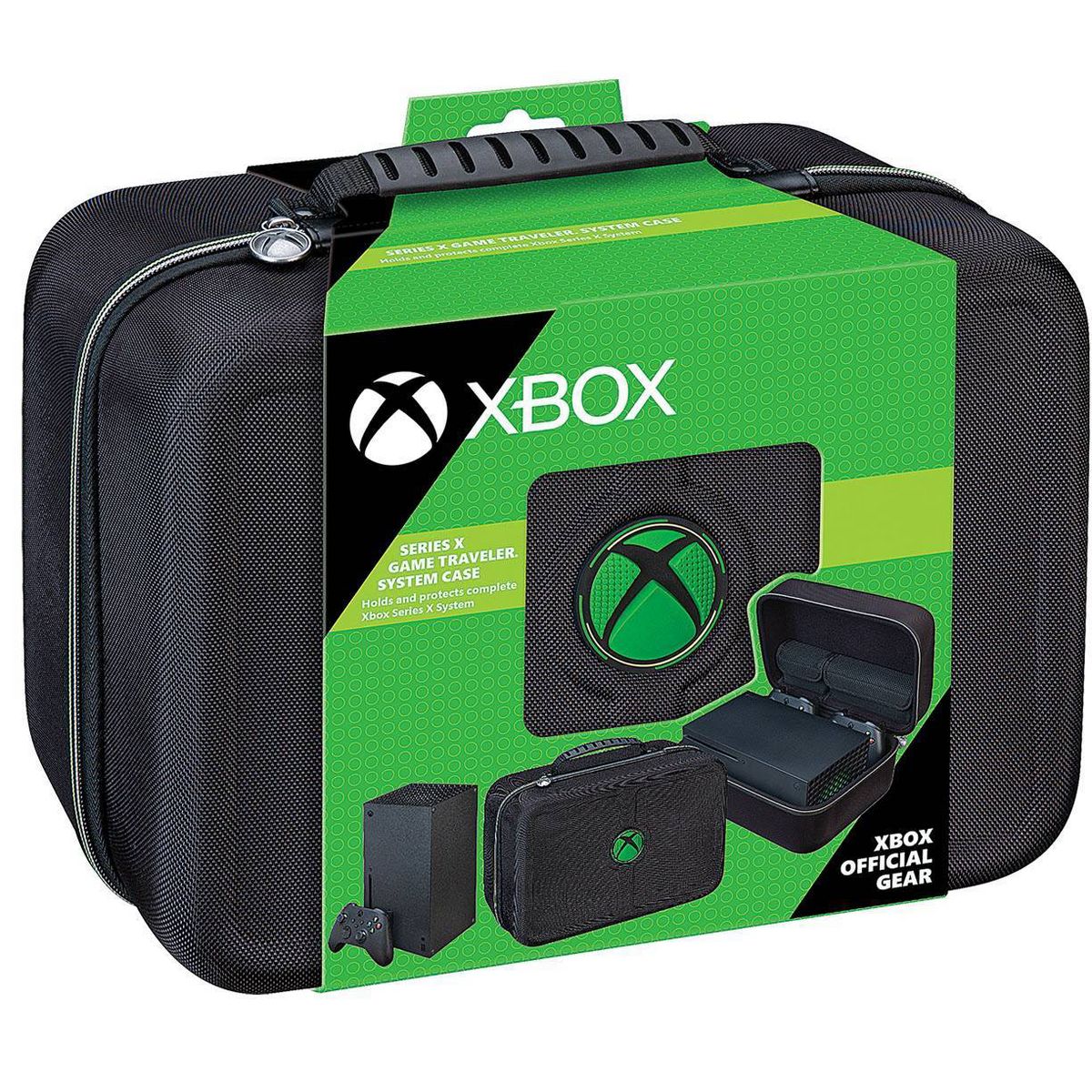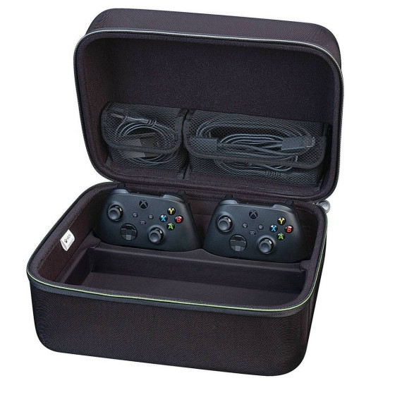 Xbox Series X Game Traveler System Case is designed to hold and protect the Xbox Series X system. It includes a recessed bottom insert to securely hold the Xbox Series X system and two Xbox controllers. An included mesh pocket holds an HDMI cable, power cord, and Seagate Storage Expansion Cards. The Game Traveler System Case has a comfortable carrying handle and hard shell for maximum protection. Microsoft Xbox System X Case. XB2020