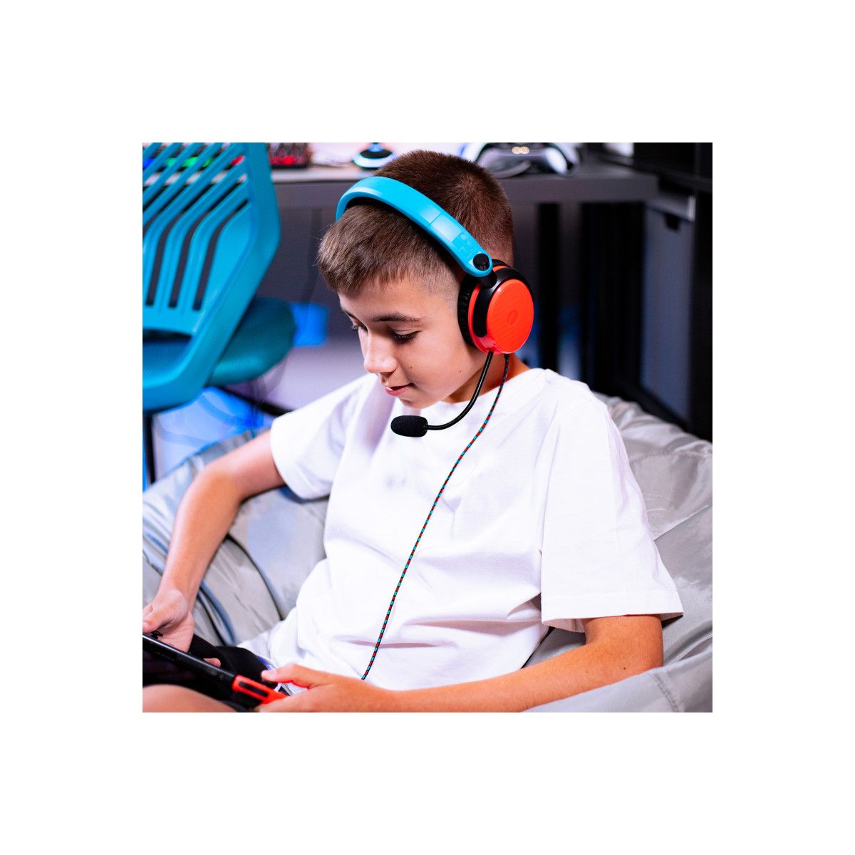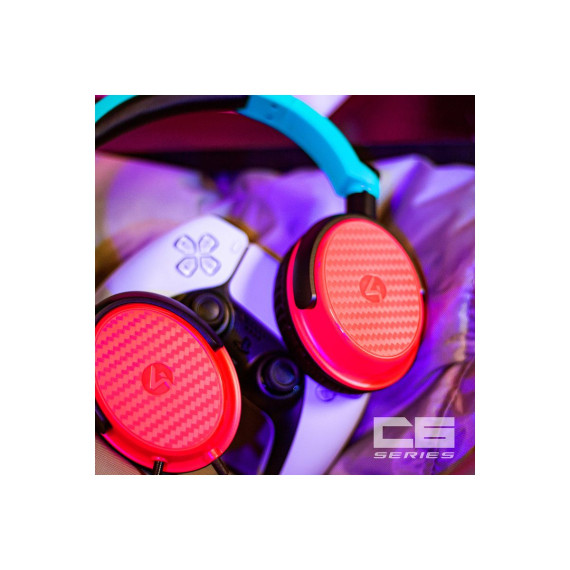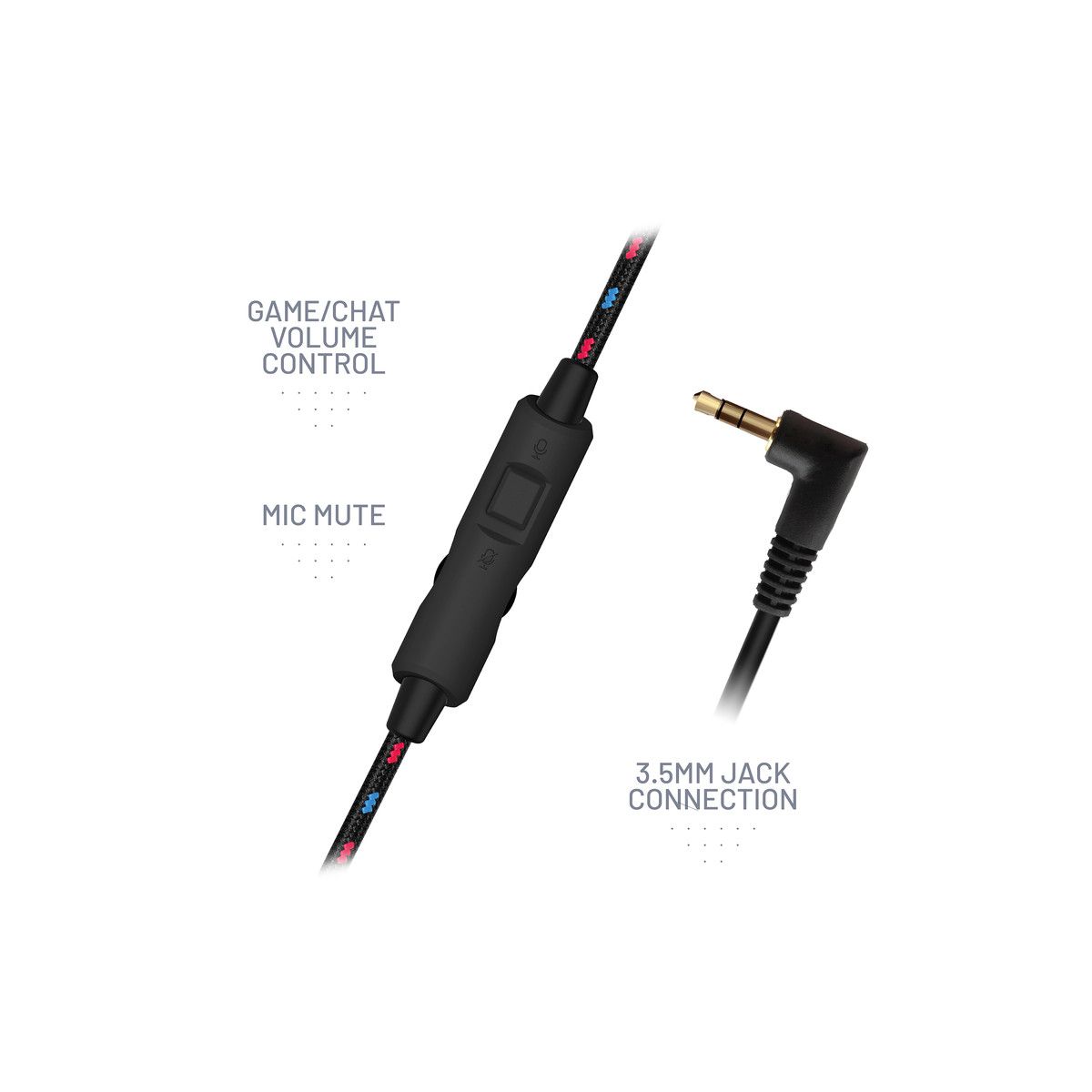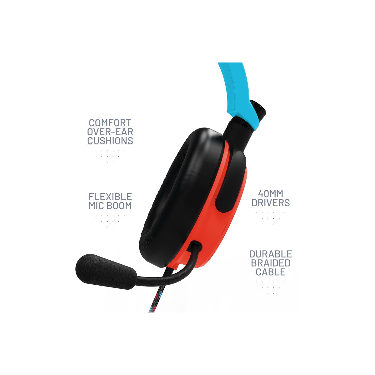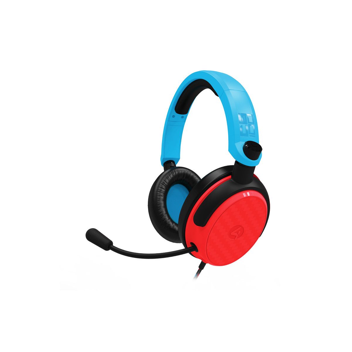 A multi-platform Gaming Headset, compatible with PS4, PS5, Xbox One, Series S, Series X, Nintendo Switch, Switch 2, PC and mobile devices.Designed for comfort and portability, it features soft-foam leatherette ear cushions for extended gameplay and fold-flat earcups for easy storage or travel. The adjustable headband ensures a secure and comfortable fit for players of all ages. Enjoy quality audio with 40mm speakers that bring your games to life, while the flexible mic captures your voice clearly for smooth team chat. Also features in-line controls that make it easy to adjust game and chat volume without interrupting gameplay.The durable braided cable resists tangling and daily wear, while the plug-and-play setup makes getting started quick and effortless.Carbon fibre effect texture finish in neon blue and red.