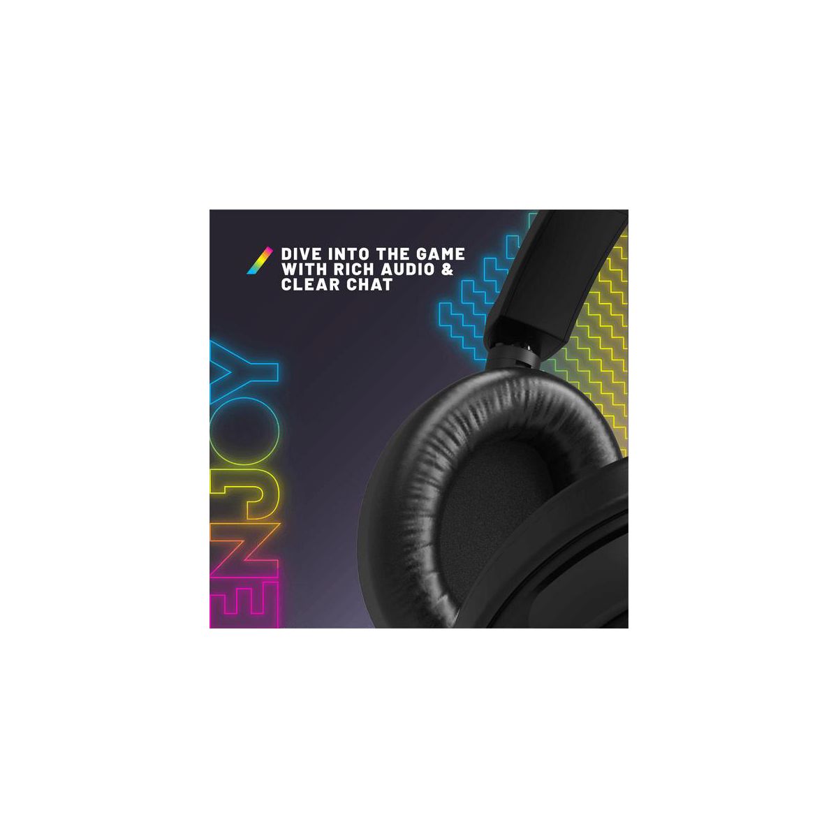 A Light-Up Gaming Headset, compatible with PS4, PS5, Xbox One, Series S, Series X, Nintendo Switch, PC and mobile devices.Light up your gameplay with rechargeable, animated lighting effects with included cable.Designed for comfort and portability, it features soft-foam leatherette ear cushions for extended gameplay and fold-flat earcups for easy storage or travel. The adjustable headband ensures a secure and comfortable fit for players of all ages. Enjoy quality audio with 40mm speakers that bring your games to life, while the flexible mic captures your voice clearly for smooth team chat. Also features in-line controls that make it easy to adjust game and chat volume without interrupting gameplay.The durable braided cable resists tangling and daily wear, while the plug-and-play setup makes getting started quick and effortless.