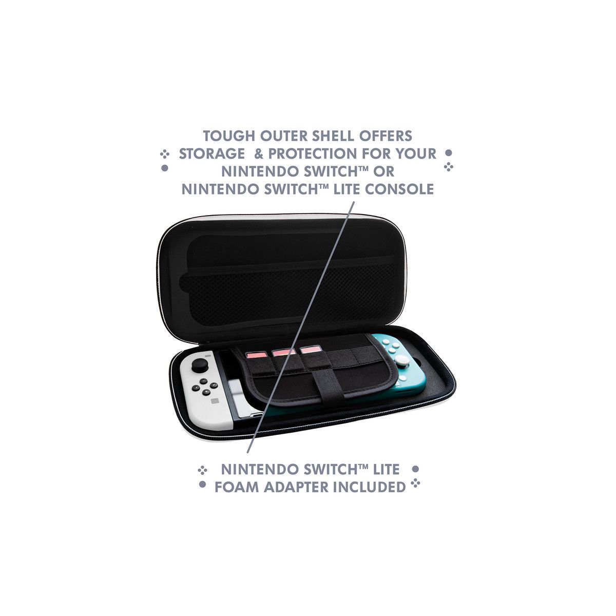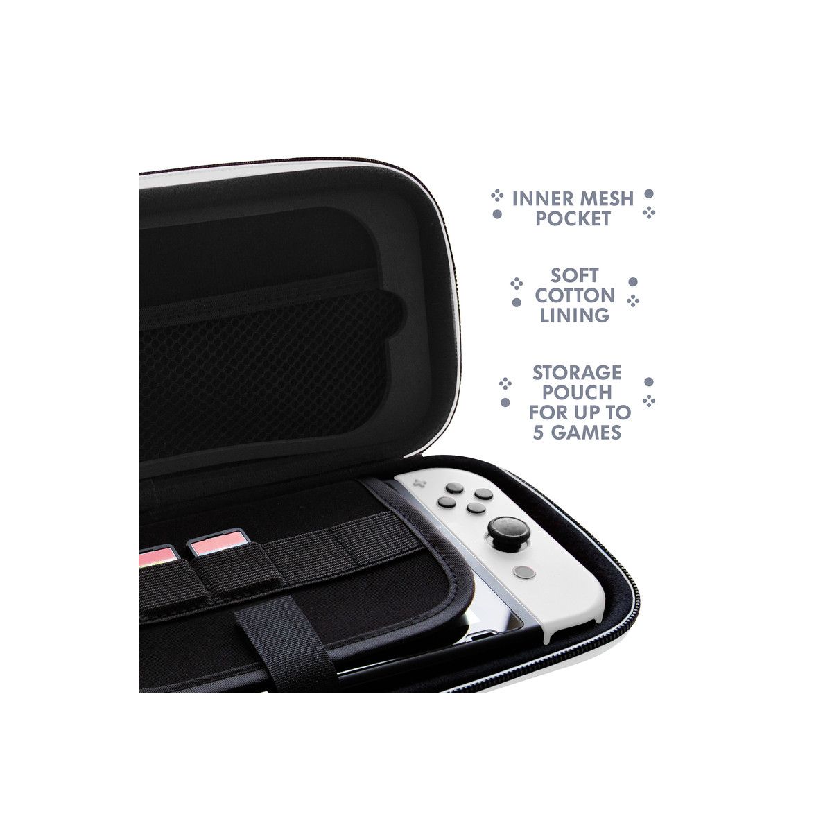 "Game on the go with the Hard-Shell Premium Travel Case, compatible with Nintendo Switch, Switch Lite & Switch OLED. Protect your console whilst you embark on epic adventures with the case's durable, hardshell exterior.The case's soft cotton lining keeps your Switch scratch-free and snug, whilst the storage feature holds up to 5 of your favourite games.Finished in black and white."