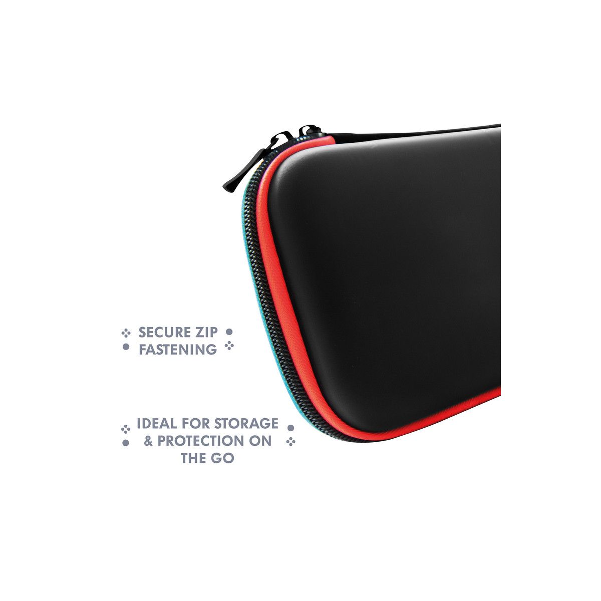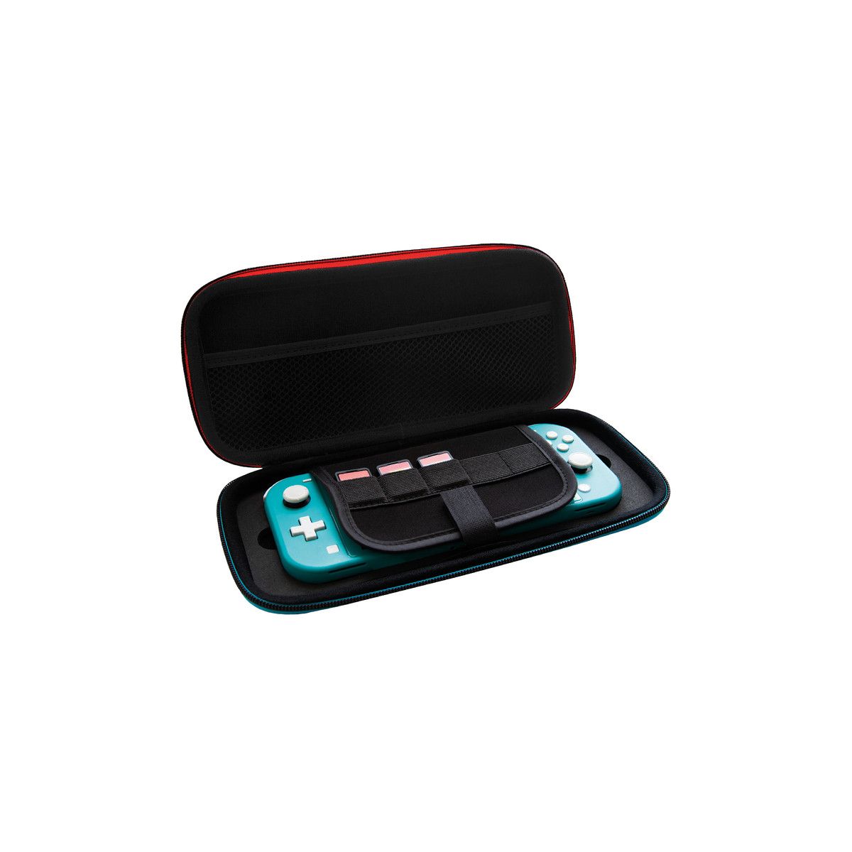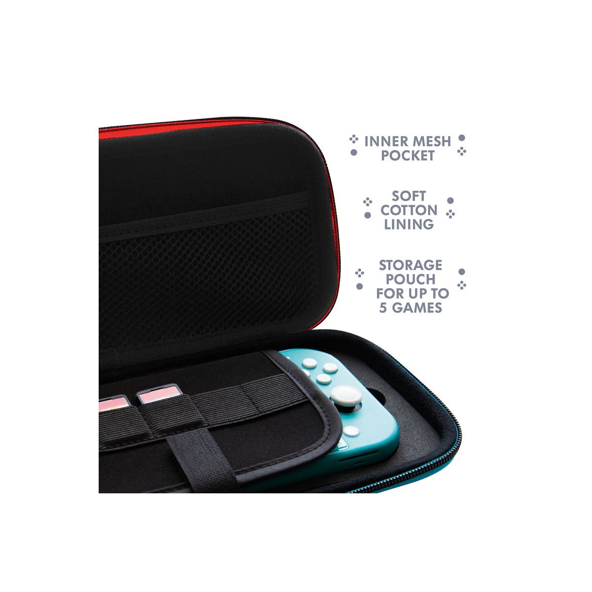 Game on the go with the Hard-Shell Premium Travel Case, compatible with Nintendo Switch, Switch Lite & Switch OLED. Protect your console whilst you embark on epic adventures with the case's durable, hardshell exterior.The case's soft cotton lining keeps your Switch scratch-free and snug, whilst the storage feature holds up to 5 of your favourite games.Black finish with neon blue and red accents.