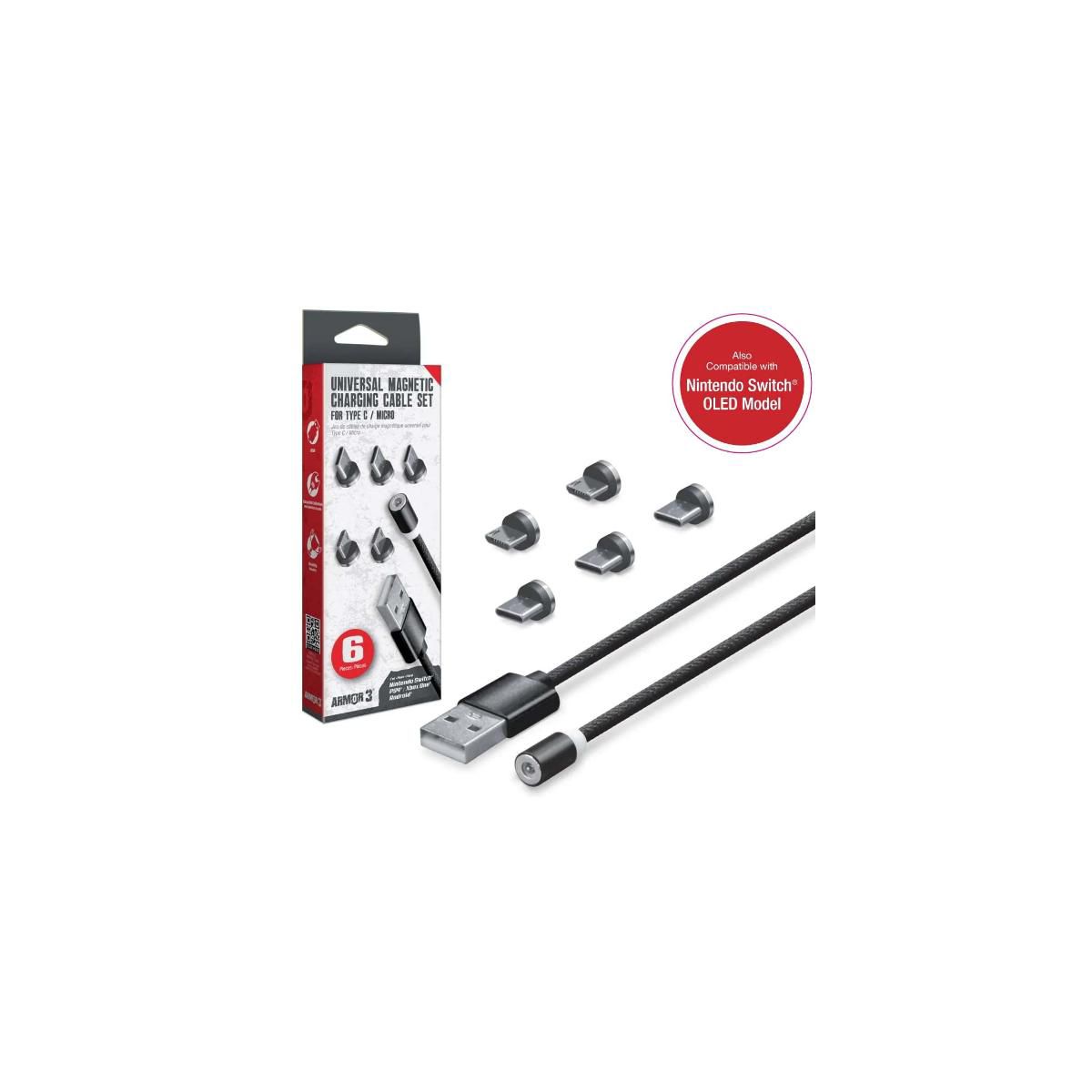 The Armor3 Universal Magnetic Charging Cable Set (6 Pcs) magnetically connects the included USB cable for stress-free charging. Simply insert the appropriate magnetic head into your chargeable USB device, and you're all set. Compatible with Nintendo Switch®, PS4®, Xbox One®, Android® and more, this set ensures versatile and convenient charging solutions.