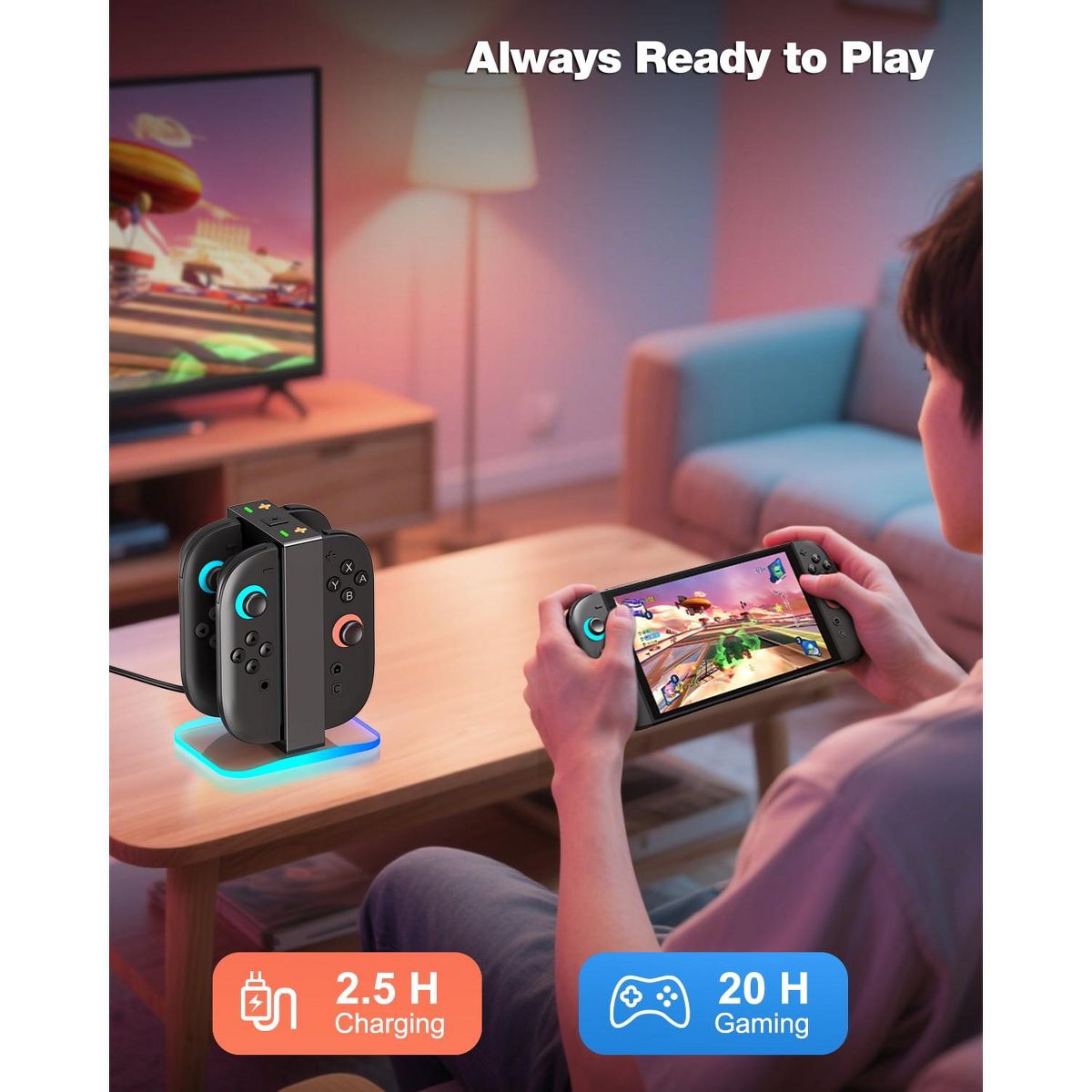 FAST 3-HOUR CHARGE delivers full power from zero to full, getting your Joy-Con ready in no time. The LIGHT-OFF MODE (long-press 3 seconds) silences all lights, ideal for bedrooms, offices, or dark environments.