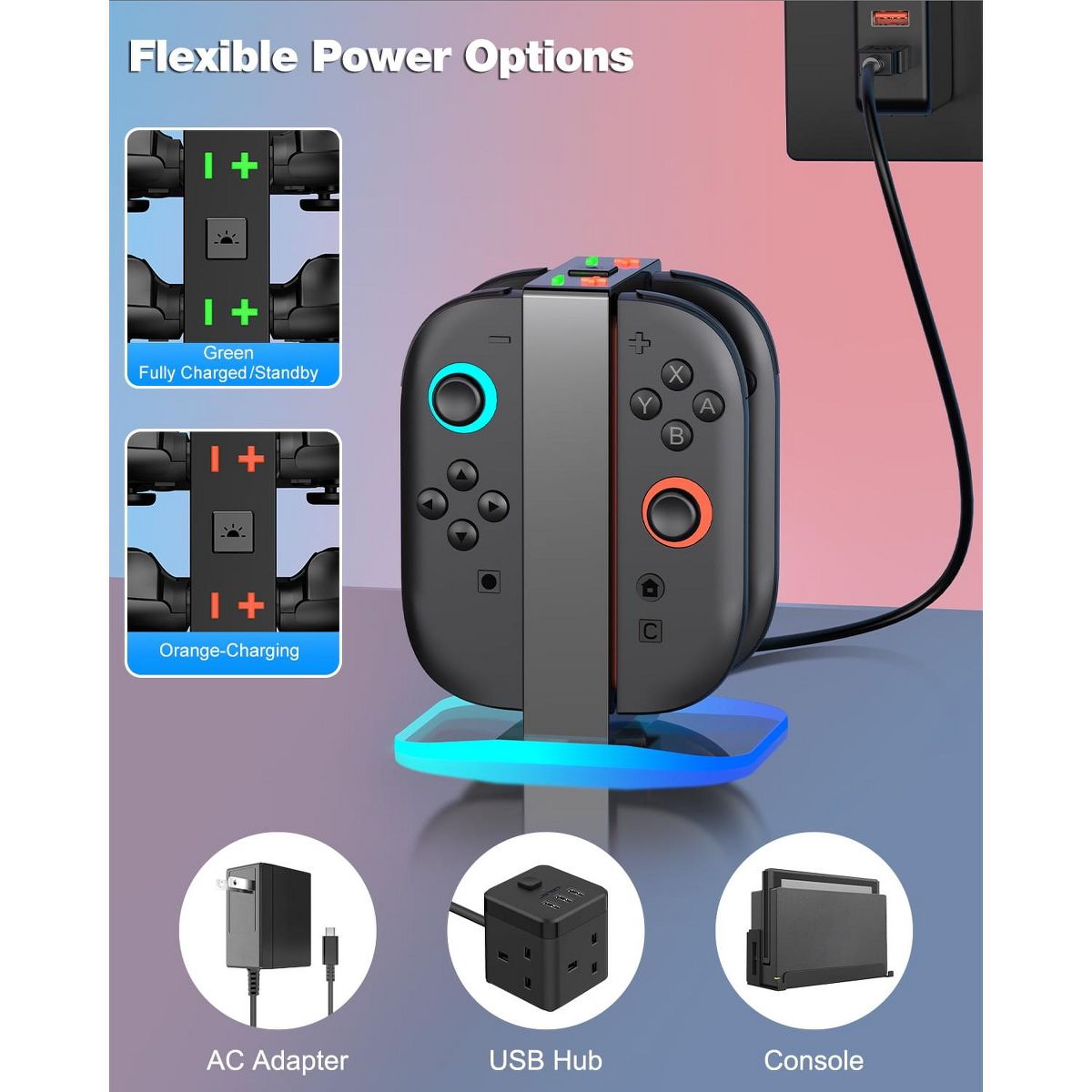 With a dual-color LED indicator, the dock displays an ORANGE light during charging and switches to GREEN when fully charged or empty, making it easy to track battery status at a glance. Customizable 6 LIGHTING EFFECTS (Slow/Fast Breathe, Red/Green/Blue, or Total Light Off) allow you to set the perfect ambiance for gaming or living spaces.