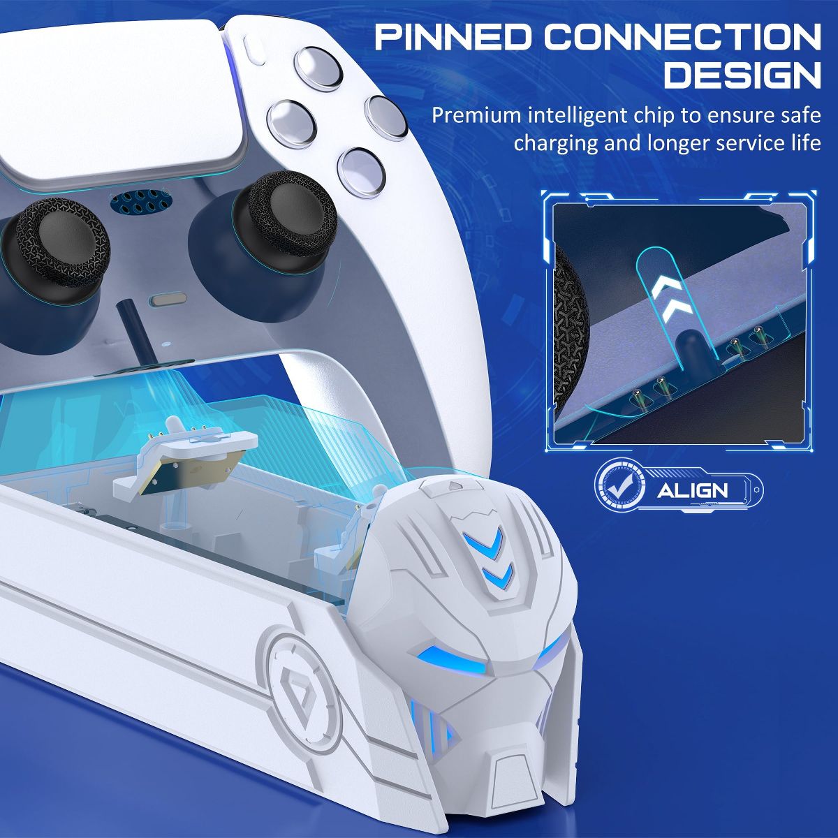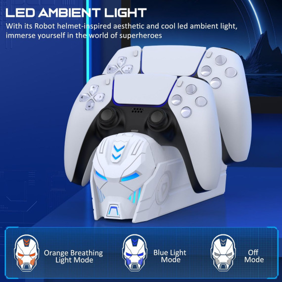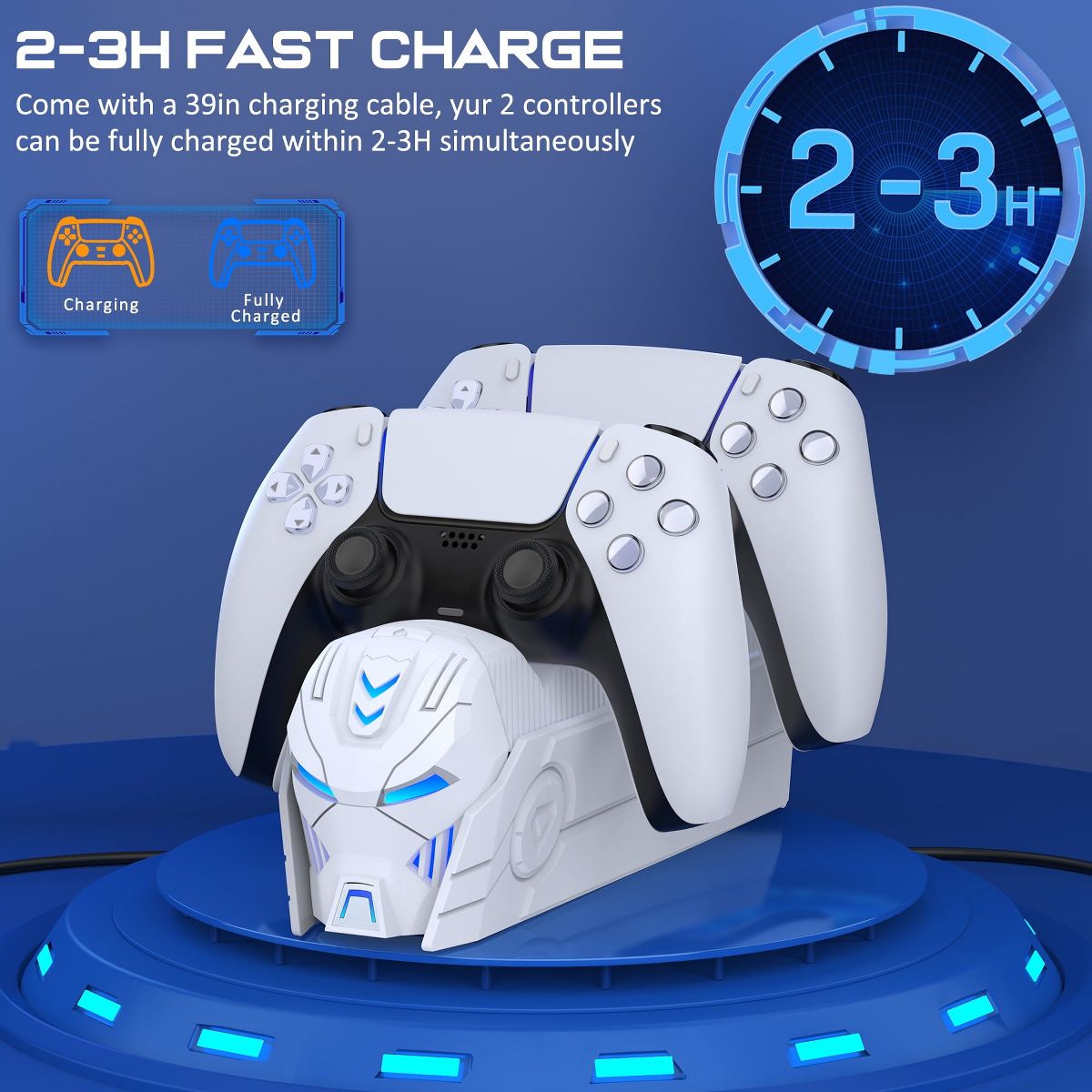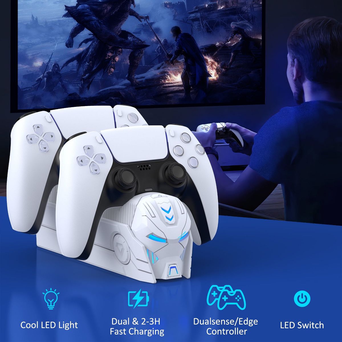 Elevate your PlayStation 5 gaming experience with the Beboncool PS5 Controller Charger. This sleek, white charging station features an Iron-Man inspired design and LED lights, allowing you to create a personalized gaming atmosphere. Charge two controllers simultaneously in just 2.5 hours, compatible with PS5 DualSense and Edge Wireless Controllers. Enjoy uninterrupted gameplay with this convenient and stylish charging solution, designed to keep your controllers powered and ready for action.