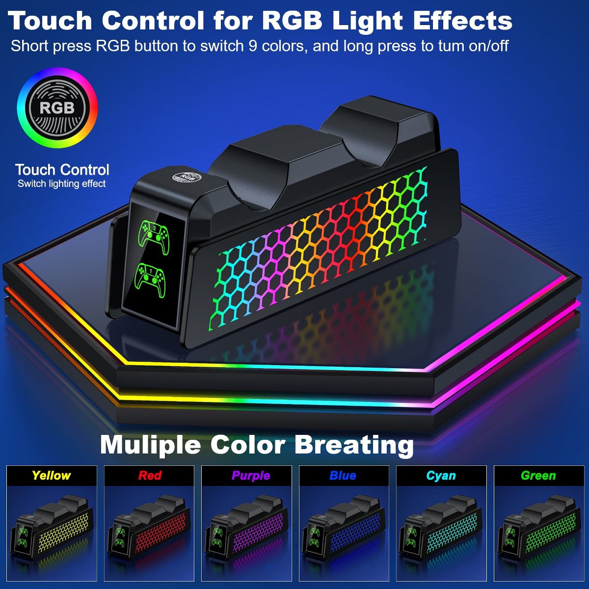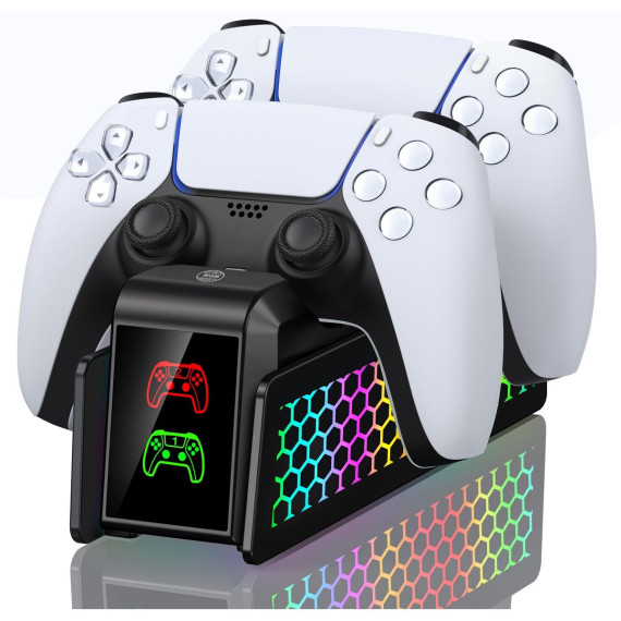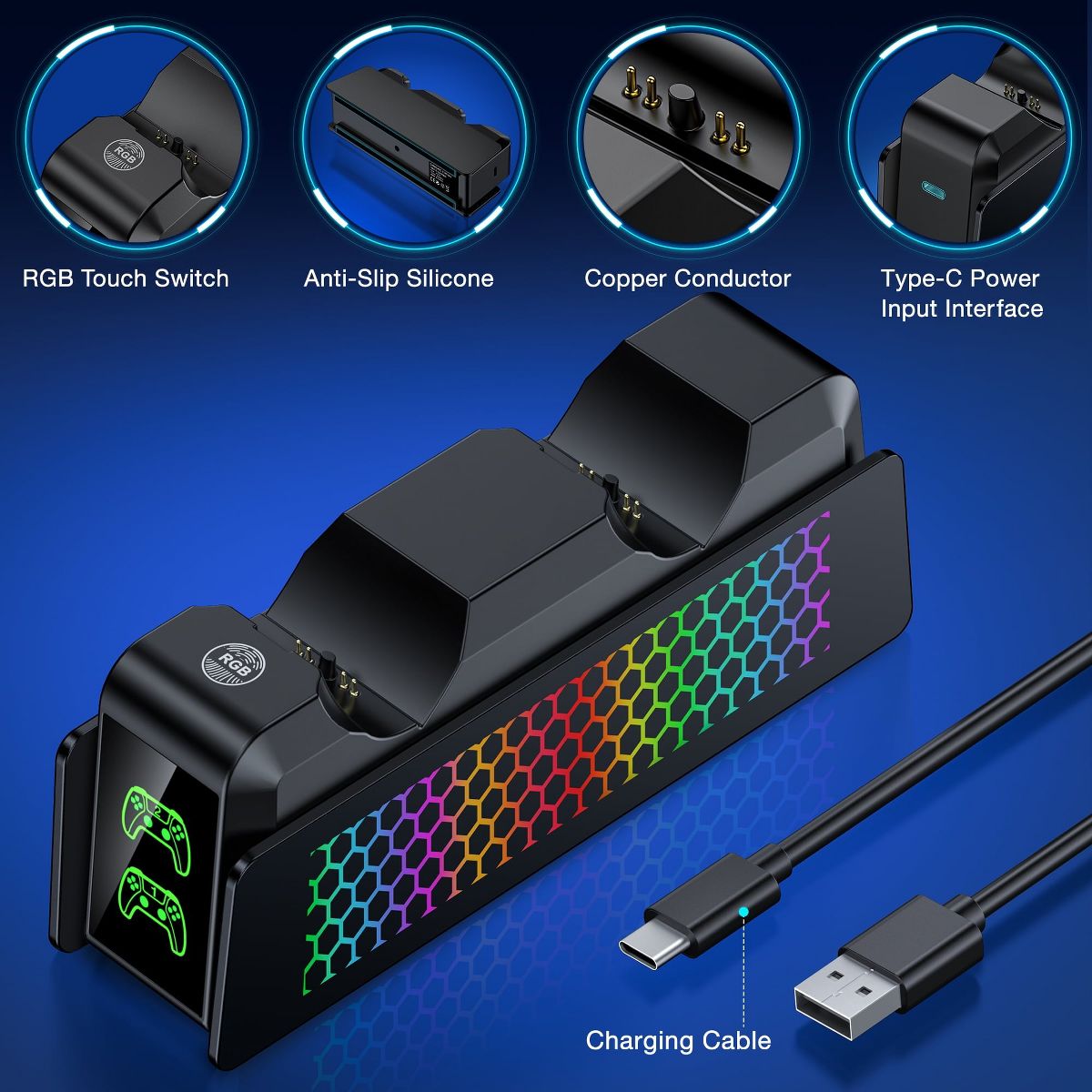 Safety-first design includes built-in protections against over-voltage, short-circuit, and overheating. Store controllers neatly in a compact design that saves desk space, while powering via PS5 USB or 5V/3A adapter (USB-C cable included). Perfect for gamers seeking a tidy gaming station with reliable charging security and dynamic ambiance lights.
