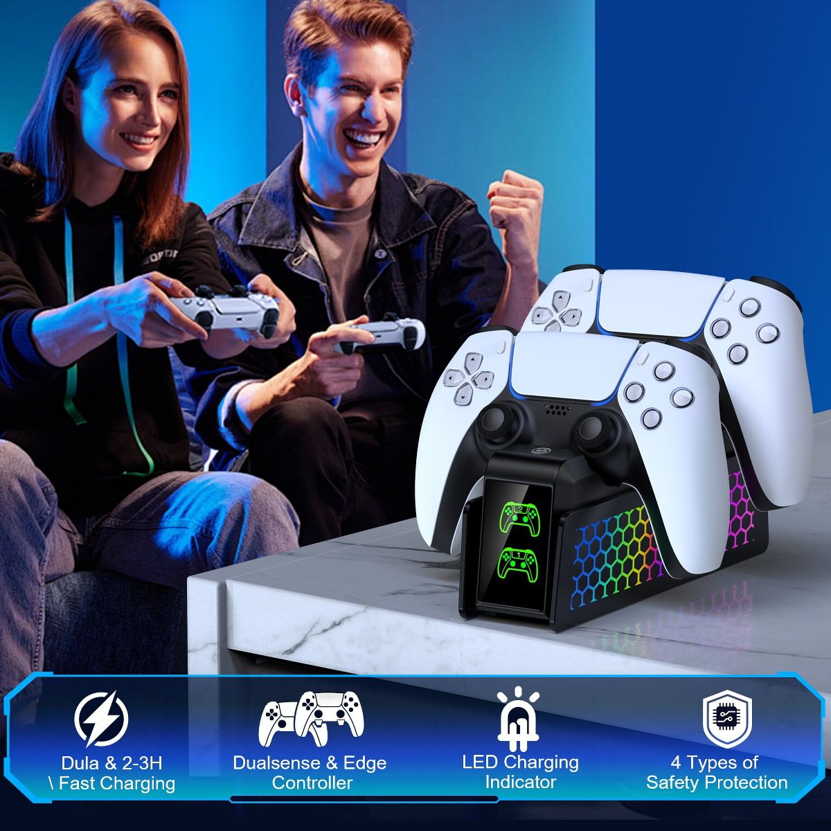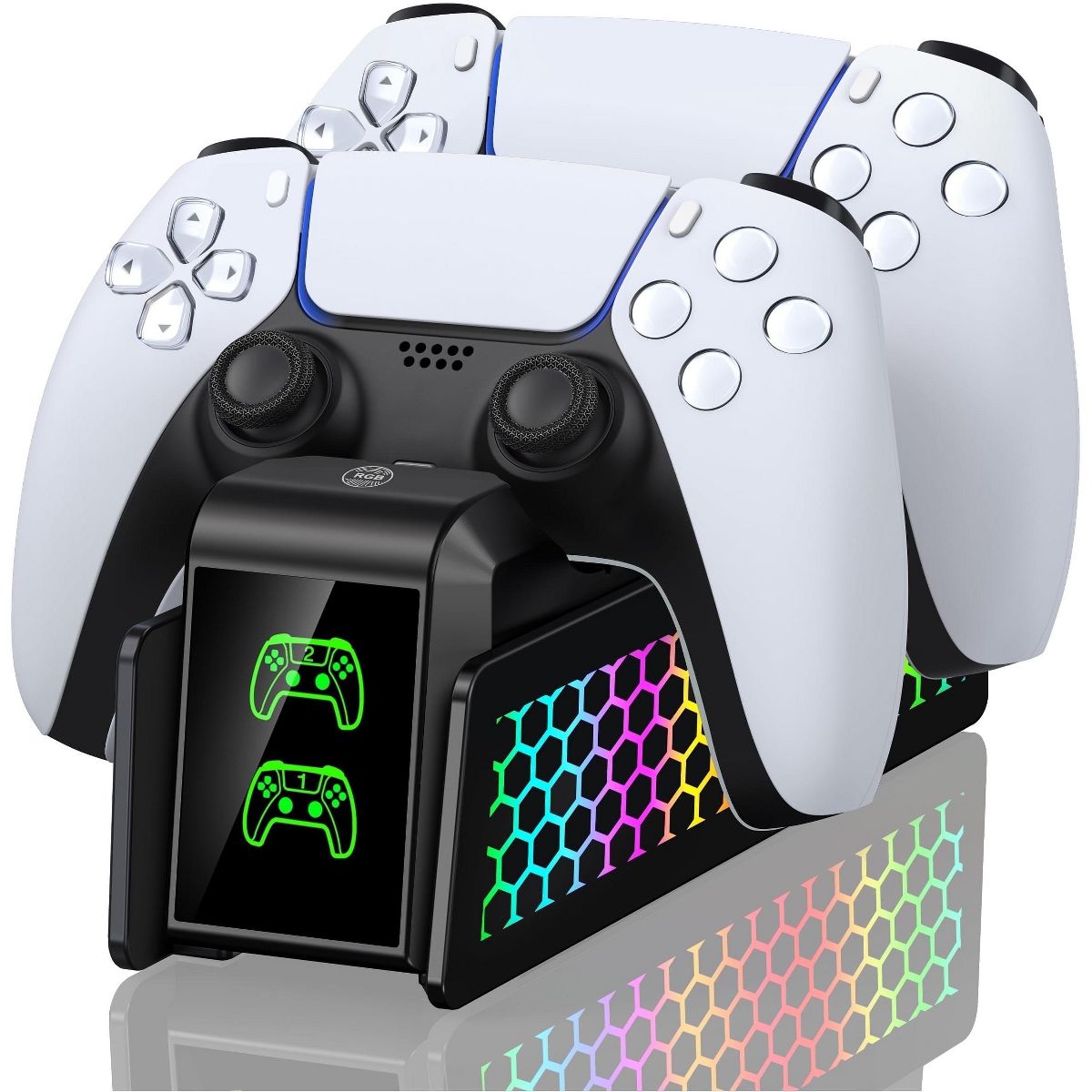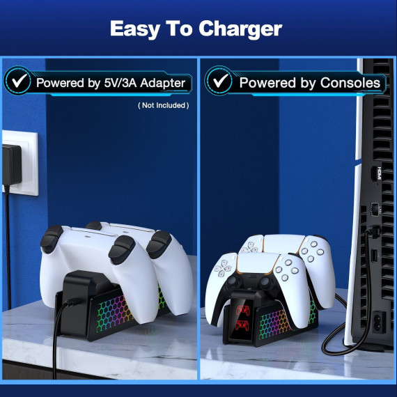 Upgrade your PS5 gaming station with this all-in-one charger: Eliminate cable clutter, monitor charging status instantly, and sync RGB lights to your gameplay vibe – all while ensuring elite-level safety for your controllers.