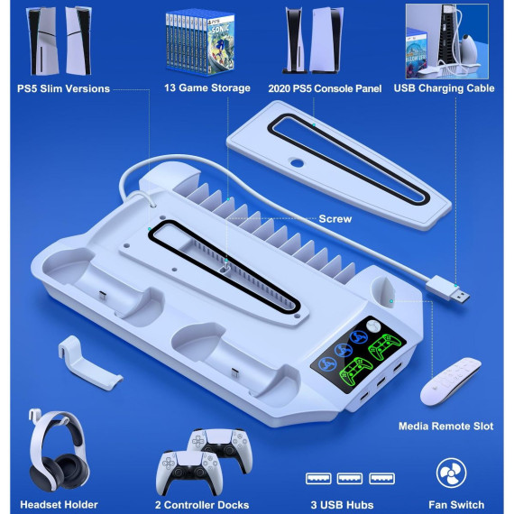 This premium PS5 stand combines dual turbo fans with a dust-proof baffle to optimize console cooling while shielding it from dust and scratches. The LED indicator panel clearly displays controller charging status (red=charging, green=full), enabling simultaneous fast charging of two DualSense controllers in 3-4 hours via USB ports or wireless USB-C adaptors. Its memory function retains your preferred fan speed (3 adjustable levels) upon power resumption, ensuring consistent performance. The vertical, space-saving design organizes your entire PS5 ecosystem—console, controllers, game discs, and media remote—in a sleek, anti-slip base with hidden cable management slots. Crafted from durable ABS plastic, it supports PS5 Pro/Slim/Digital Edition models and includes overheat/overcharge protection. Ideal as a holiday gift for gamers, this bundle elevates gameplay comfort, reduces clutter, and ensures long-term console durability.