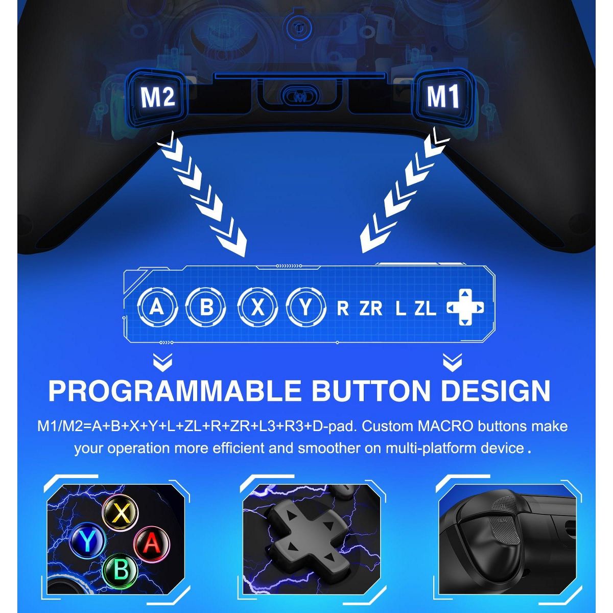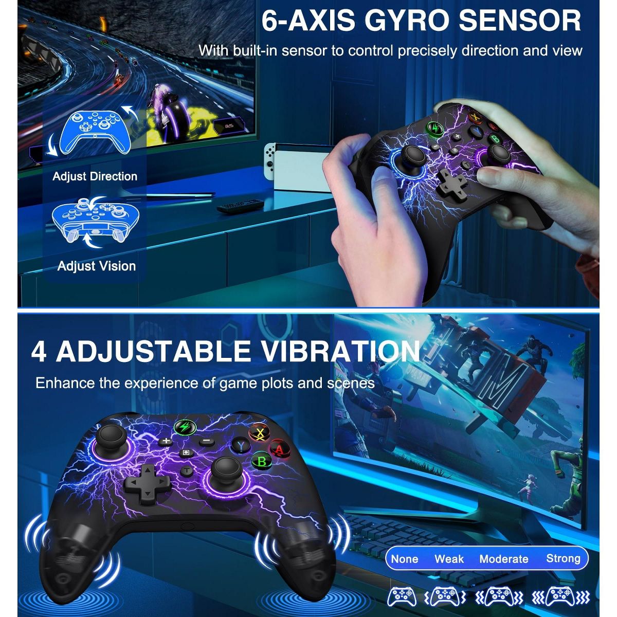 lighting modes with 9 selectable colors, it enables dynamic ambiance customization aligned with gameplay scenarios. Advanced haptic immersion is achieved through dual vibration motors and 6-axis gyroscopic motion control, enhanced by 4-level adjustable feedback intensity. Competitive gamers benefit from programmable rear buttons and turbo configuration capabilities, while the ergonomic design ensures extended comfort during marathon sessions.