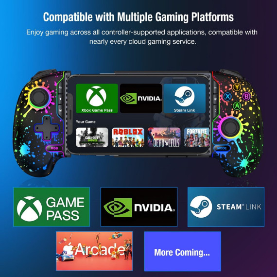 Native titles: COD Mobile/Minecraft/Genshin Impact etc. br/> Apple ecosystem: Full Apple Arcade controller-supported games (Note: Requires iOS 14+/Android 6.0+) br/> Connectivity Guide:br/> 1. Initial Pairing Hold MODE button for 3s → Rapid blue flashing → Search "Xbox Wireless Controller" via Bluetooth br/> 2. Reconnection Press MODE button → Slow blue flashing → Auto-reconnects to paired devices.