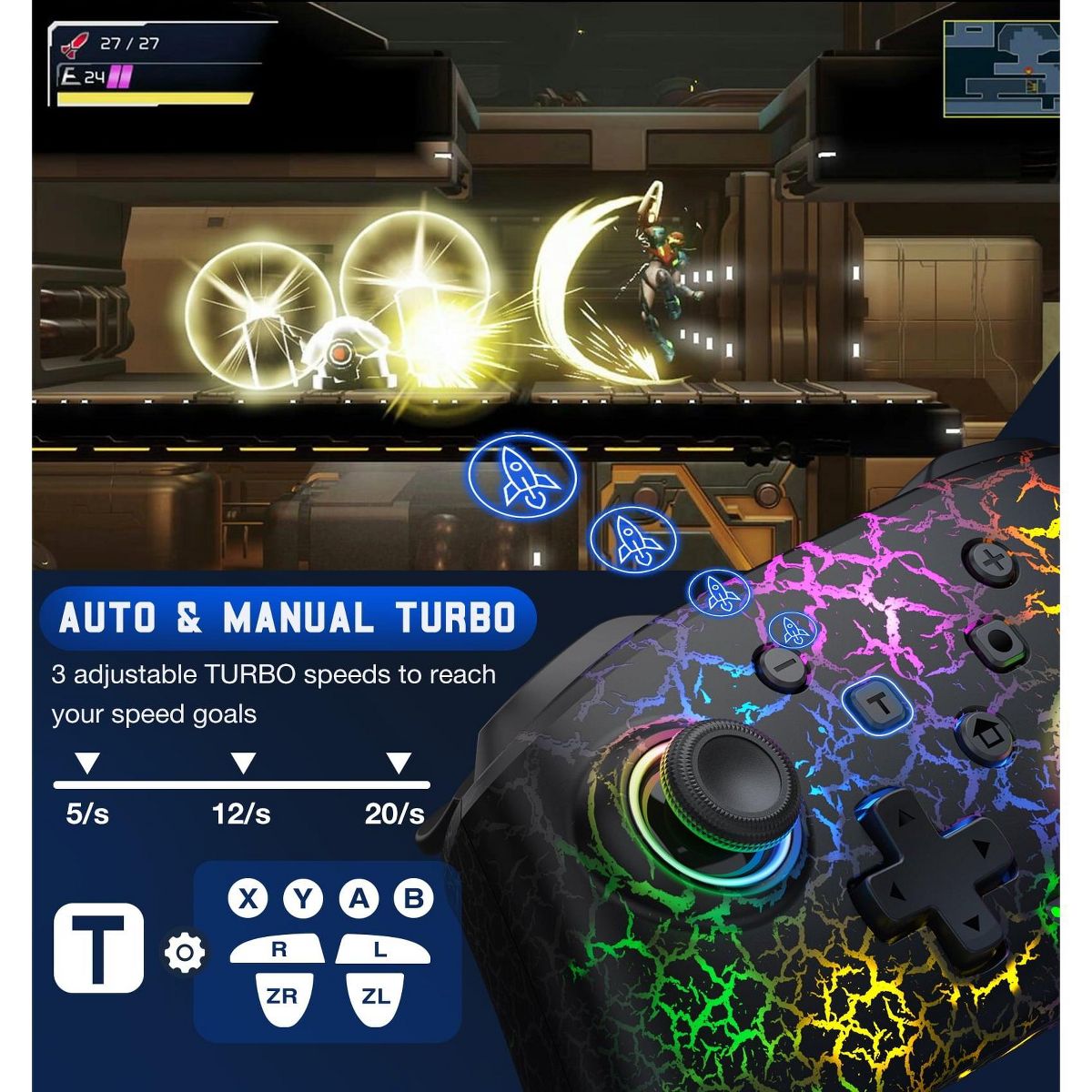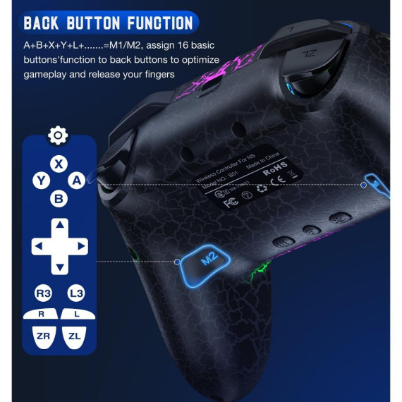 Elevate your gaming with the BEBONCOOL Wireless Pro Controller for Nintendo Switch, PC, iOS, and Android. Featuring a striking crack-pattern non-slip grip and ergonomic design (reducing hand fatigue by 37%), this high-strength ABS controller combines style and comfort. Customize gameplay with 9 adjustable LED colors (molten red, brilliant blue, and more), Turbo modes (5/12/20 shots/sec), and 4-level vibration feedback for immersive action. Enjoy 12-16 hours of playtime (2x battery capacity vs. competitors) and seamless pairing via SYNC or HOME button. Perfect for fast-paced games and multi-platform versatility!