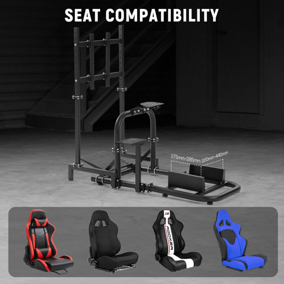Dardoo racing sim cockpit provides a highly customizable adjustment system with a two-stage steering wheel platform for dual height and angle control, alongside adjustable pedal and gearshift settings, all built upon a robust vertical flange structure that multiplies stability and durability. Its high compatibility covers racing peripherals from Logitech, Fanatec, and Thrustmaster, including direct-drive wheels up to 15N.m, and comes with an adjustable monitor stand supporting screens up to 65 inches.