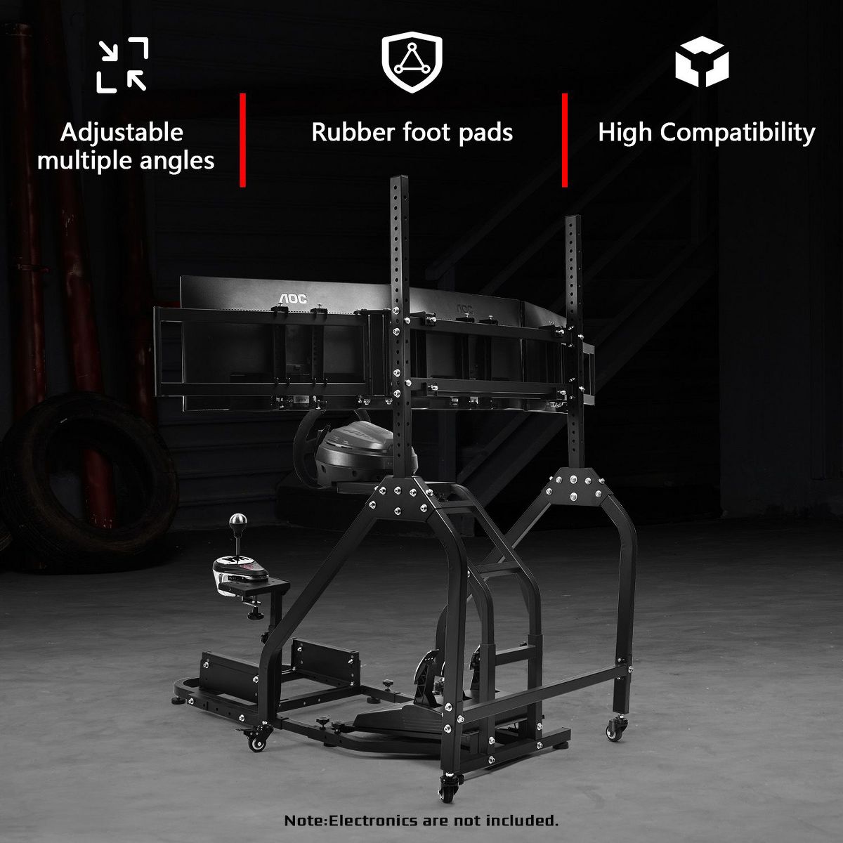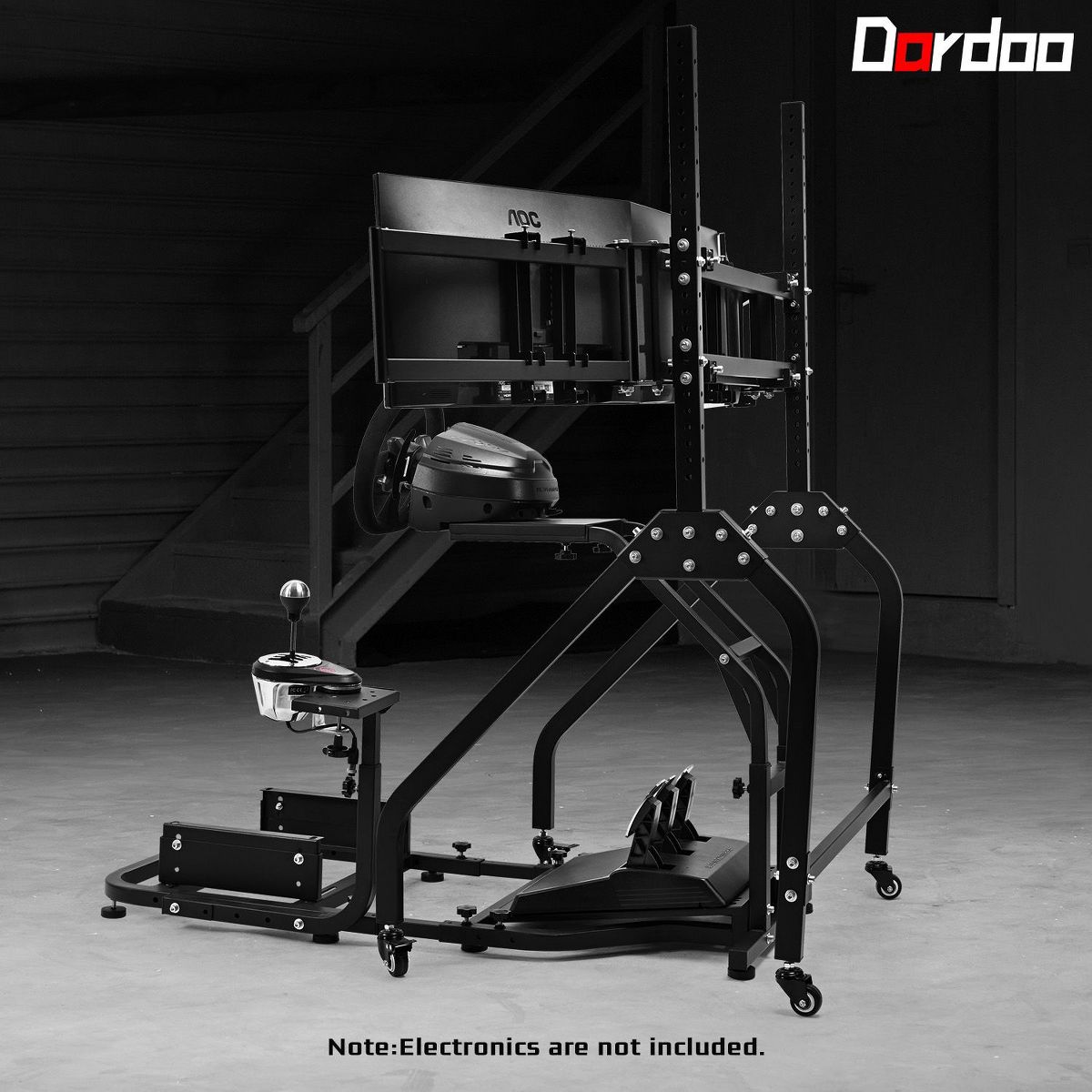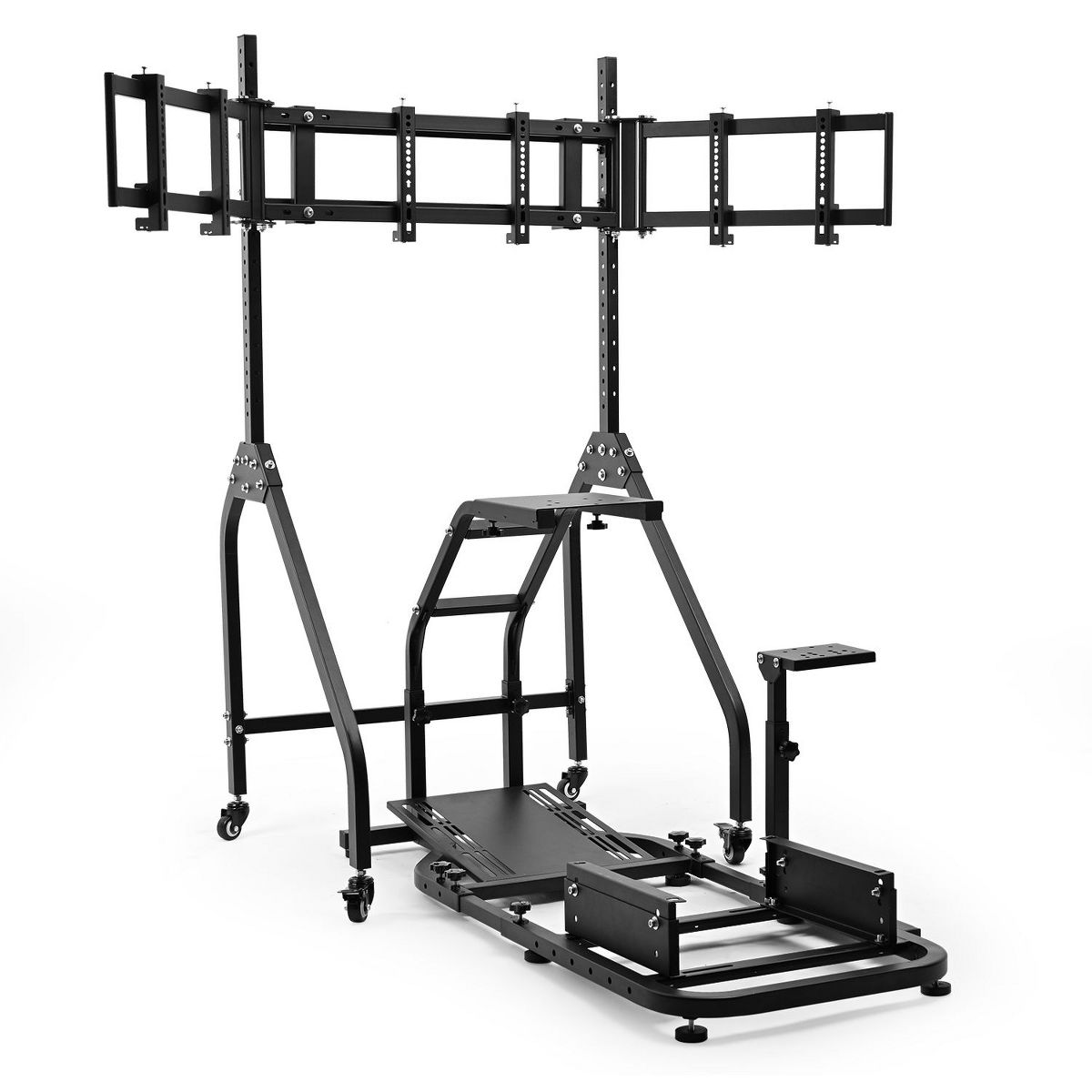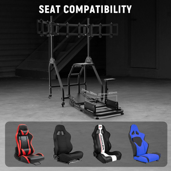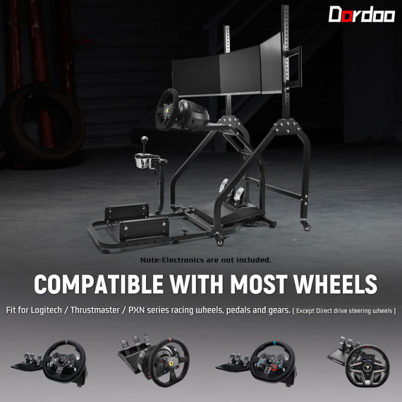 Dardoo the triple monitor mount included in this product holds three screens securely while allowing easy room rearrangement. The stand rolls on locking wheels and adjusts for perfect viewing height. Please note this product includes only the frame and triple monitor stand - steering wheels, pedals and other electronics must be bought separately to complete your racing setup.