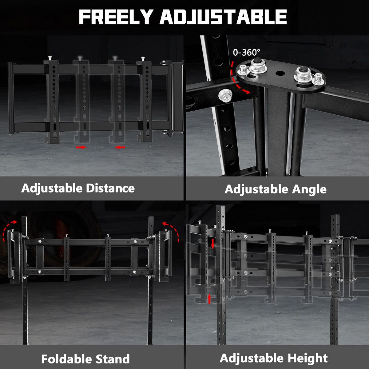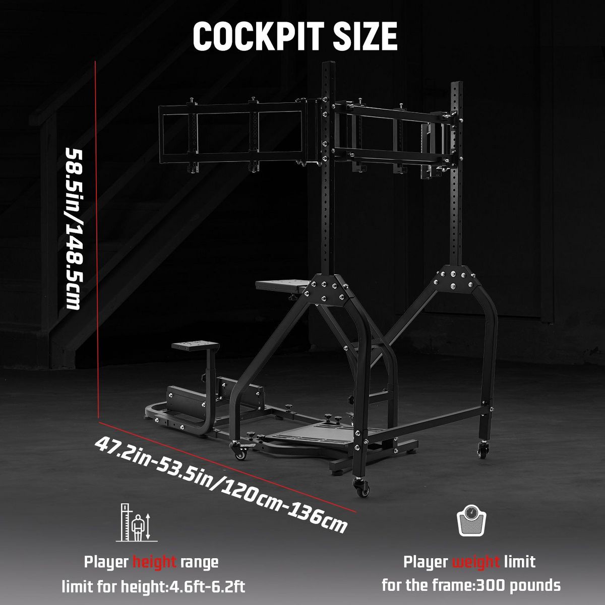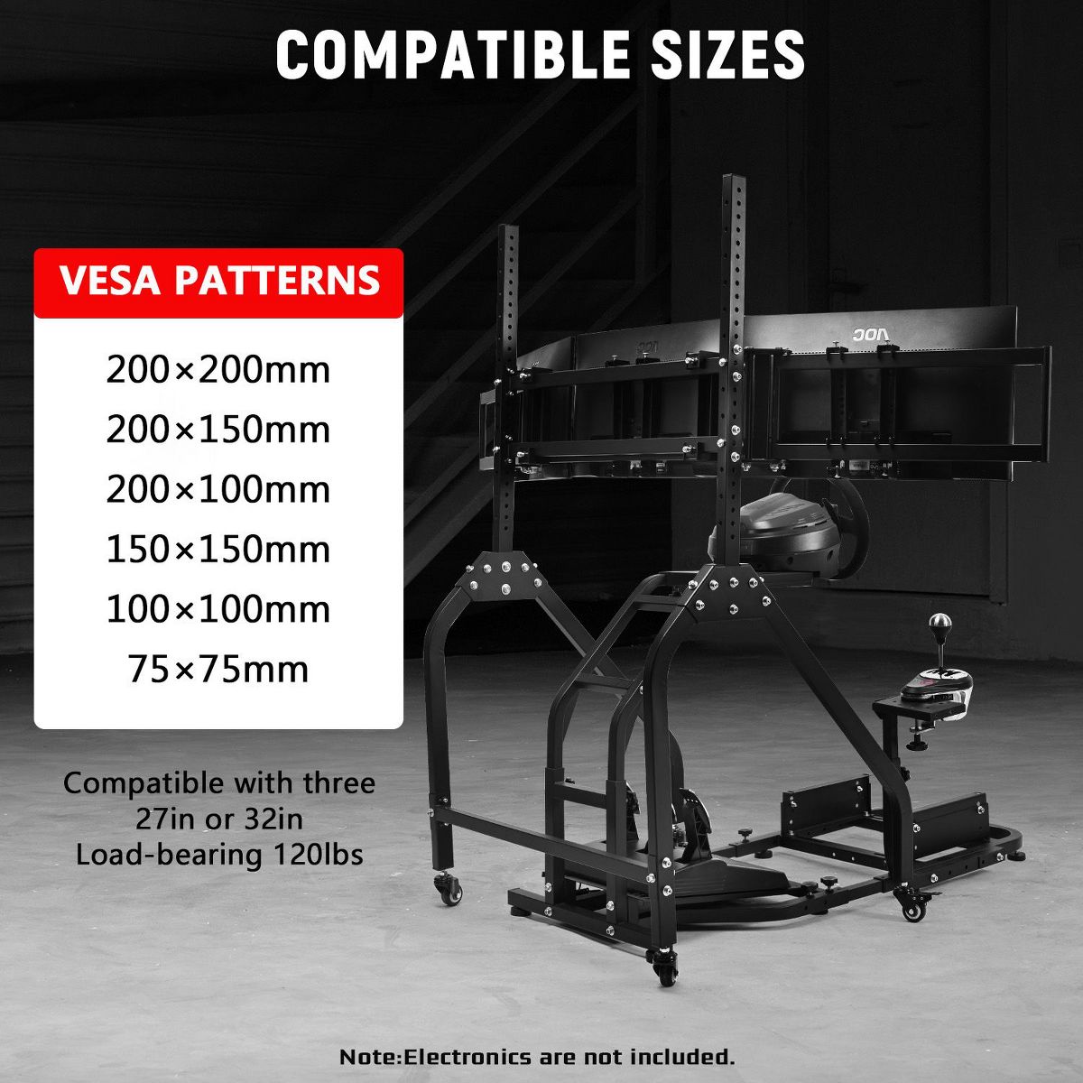 Dardoo the triple monitor mount included in this product holds three screens securely while allowing easy room rearrangement. The stand rolls on locking wheels and adjusts for perfect viewing height. Please note this product includes only the frame and triple monitor stand - steering wheels, pedals and other electronics must be bought separately to complete your racing setup.