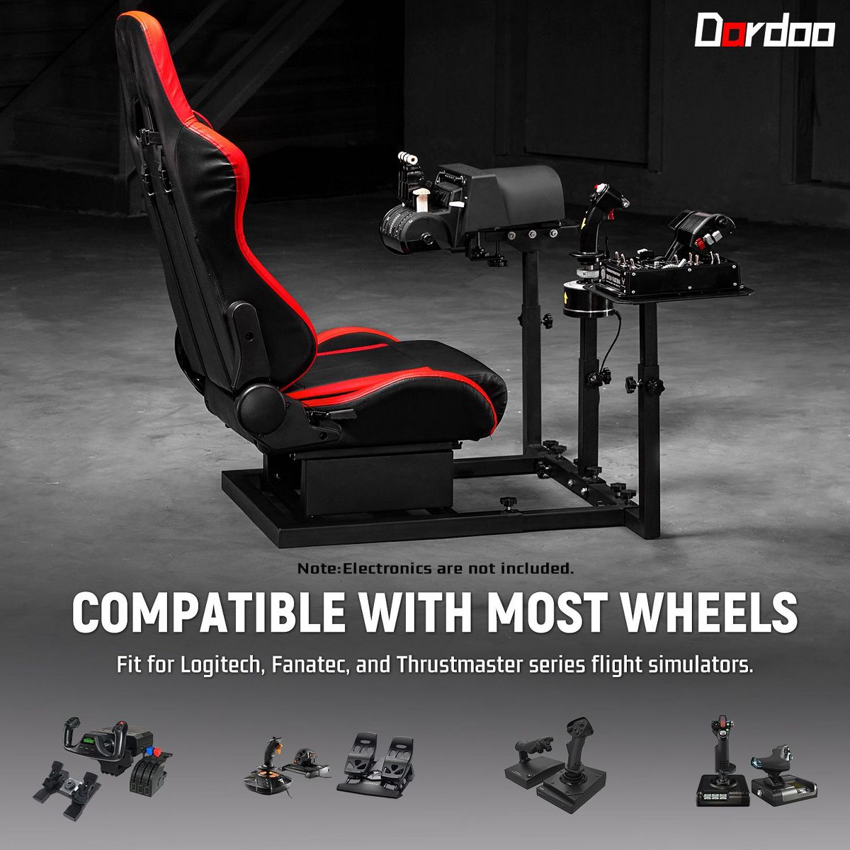 Dardoo flight sim cockpit maintains cross-platform compatibility through adjustable mounting solutions and universal interface panels, creating stable foundations for both flight and racing applications. Please note that control devices including throttle units, joysticks, and steering wheels are not included with the frame, allowing users to select their preferred compatible equipment.