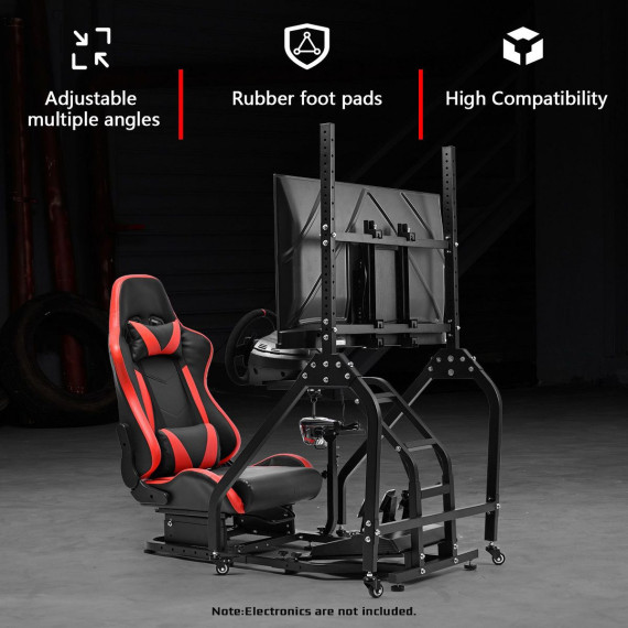 Dardoo ecosystem is completed by a stable yet mobile monitor stand with locking wheels and a heavy-duty cockpit construction that supports up to 300lbs. With non-slip rubber feet for firm stability on any floor and wide compatibility with major accessory brands, Dardoo creates an incredibly immersive and flexible platform for all sim racers and flight enthusiasts. Please note, all electronic peripherals and monitors are not included.