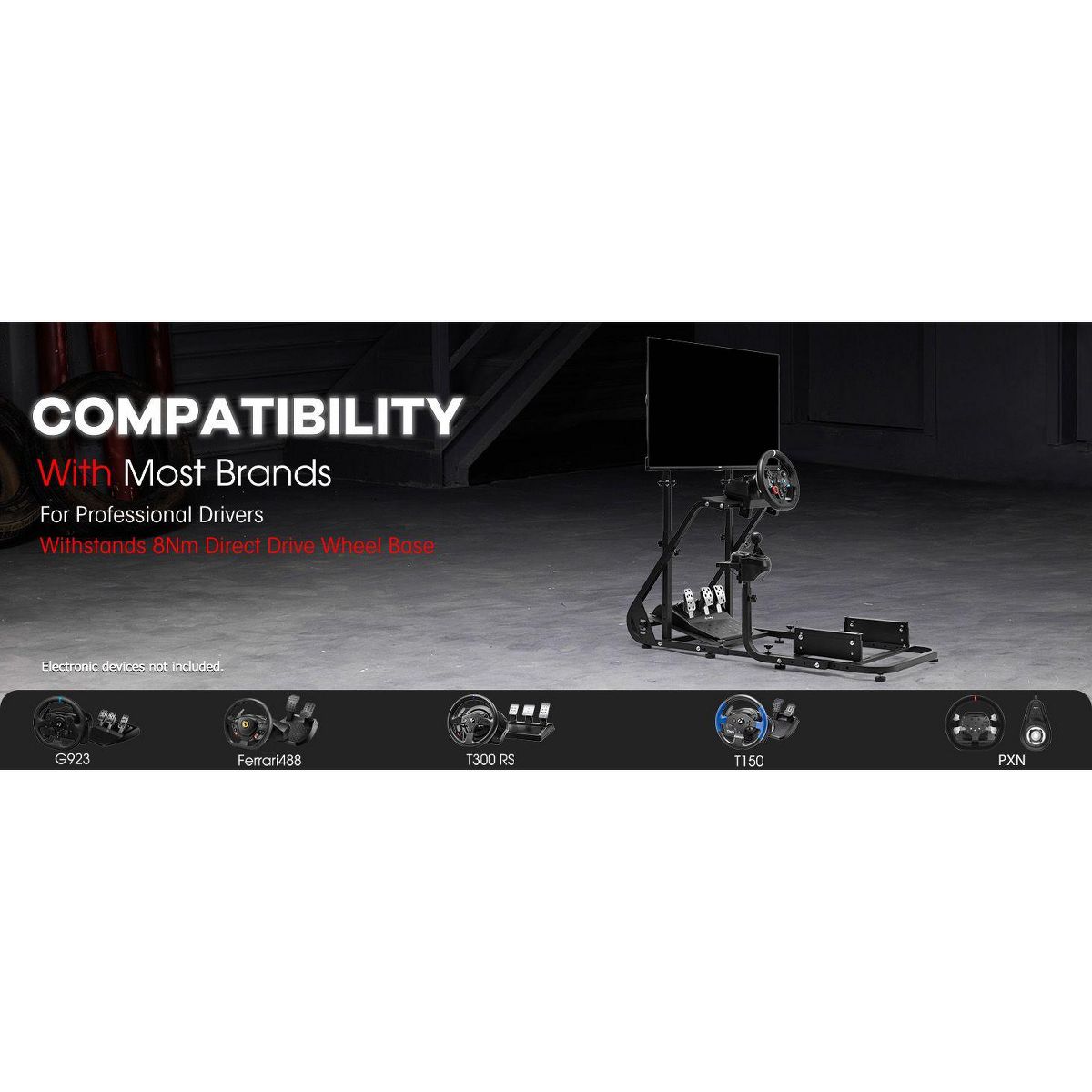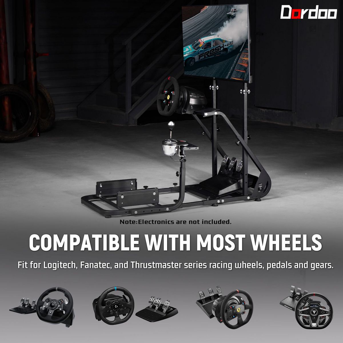 Dardoo designed this stand for universal use, ensuring compatibility with most major racing brands like Logitech, Fanatec, and Thrustmaster. Please be aware that the Dardoo gaming frame is sold separately and does not include the handbrake, pedals, seat, steering wheel, or shifter.