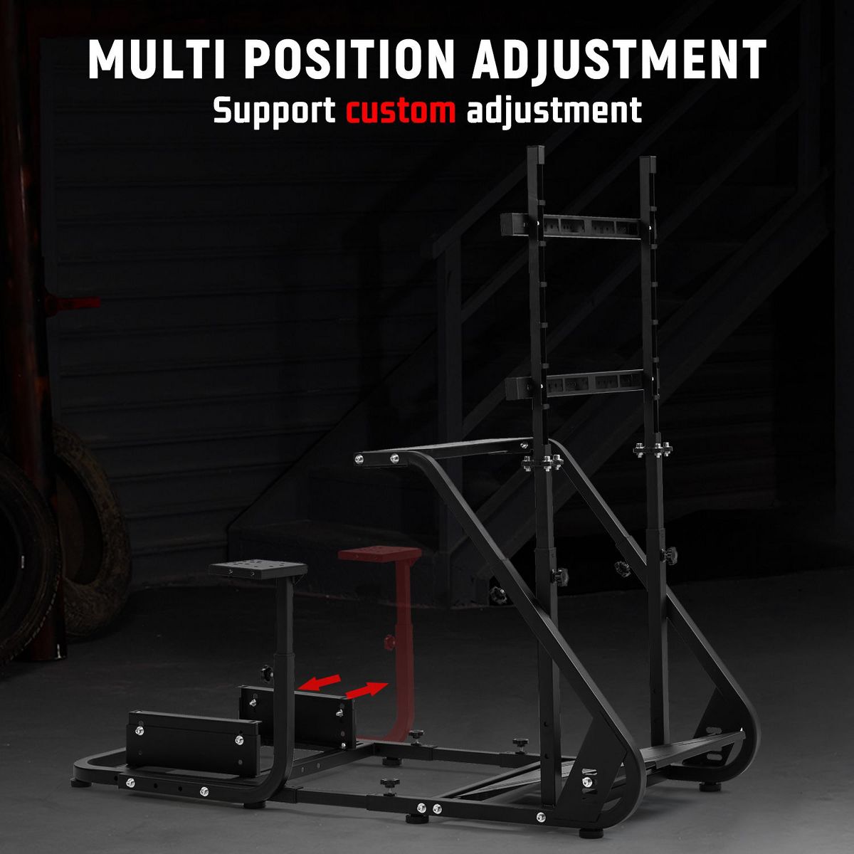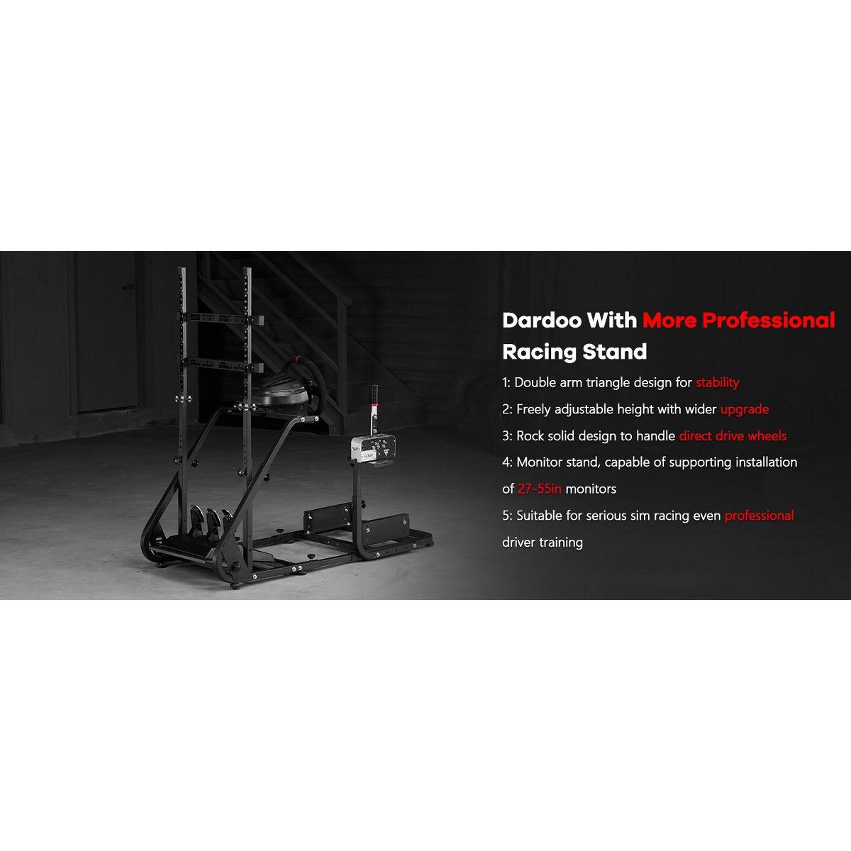 Dardoo steering wheel stand features an upgraded dual-column structure with integrated mounting points for a monitor bracket, offering enhanced stability for an immersive DIY setup. It is highly adaptable, compatible with over 90% of market gaming chairs and robust enough for direct-drive wheels, while also offering extensive customization for steering wheel, shifter, pedal, and seat positioning.