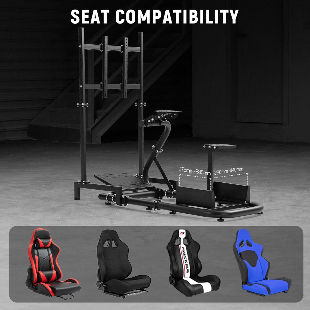 Dardoo monitor bracket and base are designed with a U-shaped right angle and are connected and fixed to the large circular tube bracket through arc-shaped clamps. The front and rear positions can be freely adjusted to adapt to different usage distances. Dardoo racing simulatior cockpit can be suitable for people with a height of 1.5~1.9 meters, the load-bearing capacity of the seat can support up to 400LBS, and the pedal can support up to 120LBS. Use four hole flanges for connection and fixation, facilitating assembly and disassembly.
